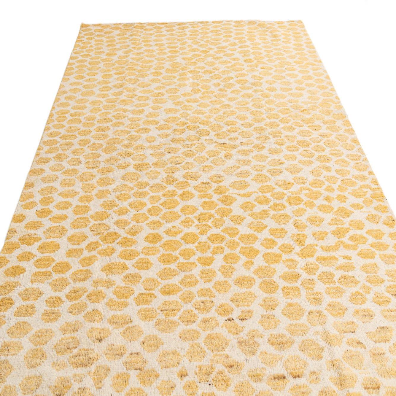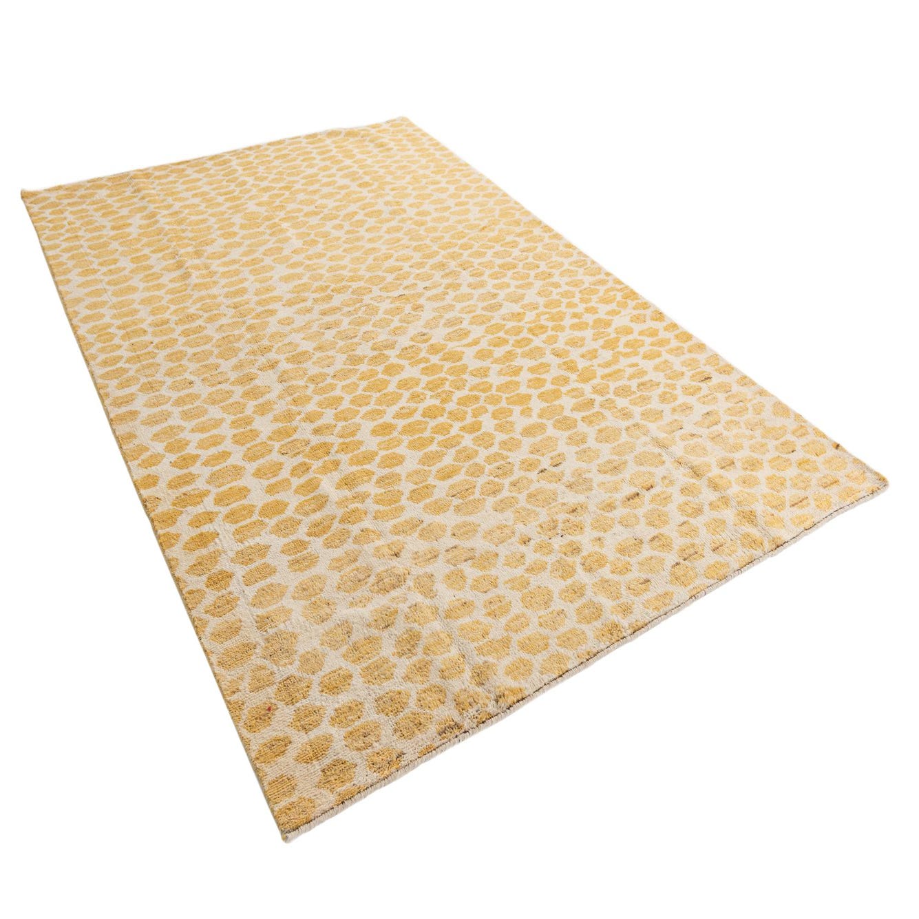 A 6x9 rectangular yellow and cream wool shag rug with an abstract tribal pattern, suitable for a living room or bedroom.
