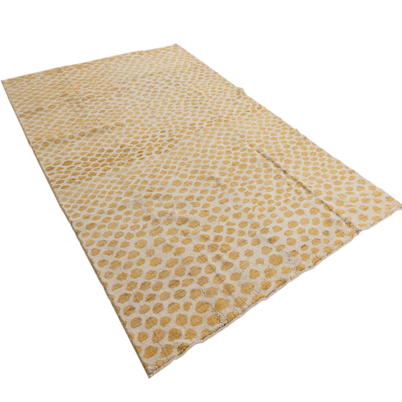 This Moroccan collection rug boasts a gold and ivory palette that provides a radiant yet soothing feel to any space. The gold background is artfully complemented by the ivory pattern, invoking a sense of traditional Moroccan design with a contemporary twist. Hand-knotted from 100% wool, it offers a dense pile that lends texture and depth. The rug's fringe adds a classic decorative element synonymous with authentic craftsmanship.