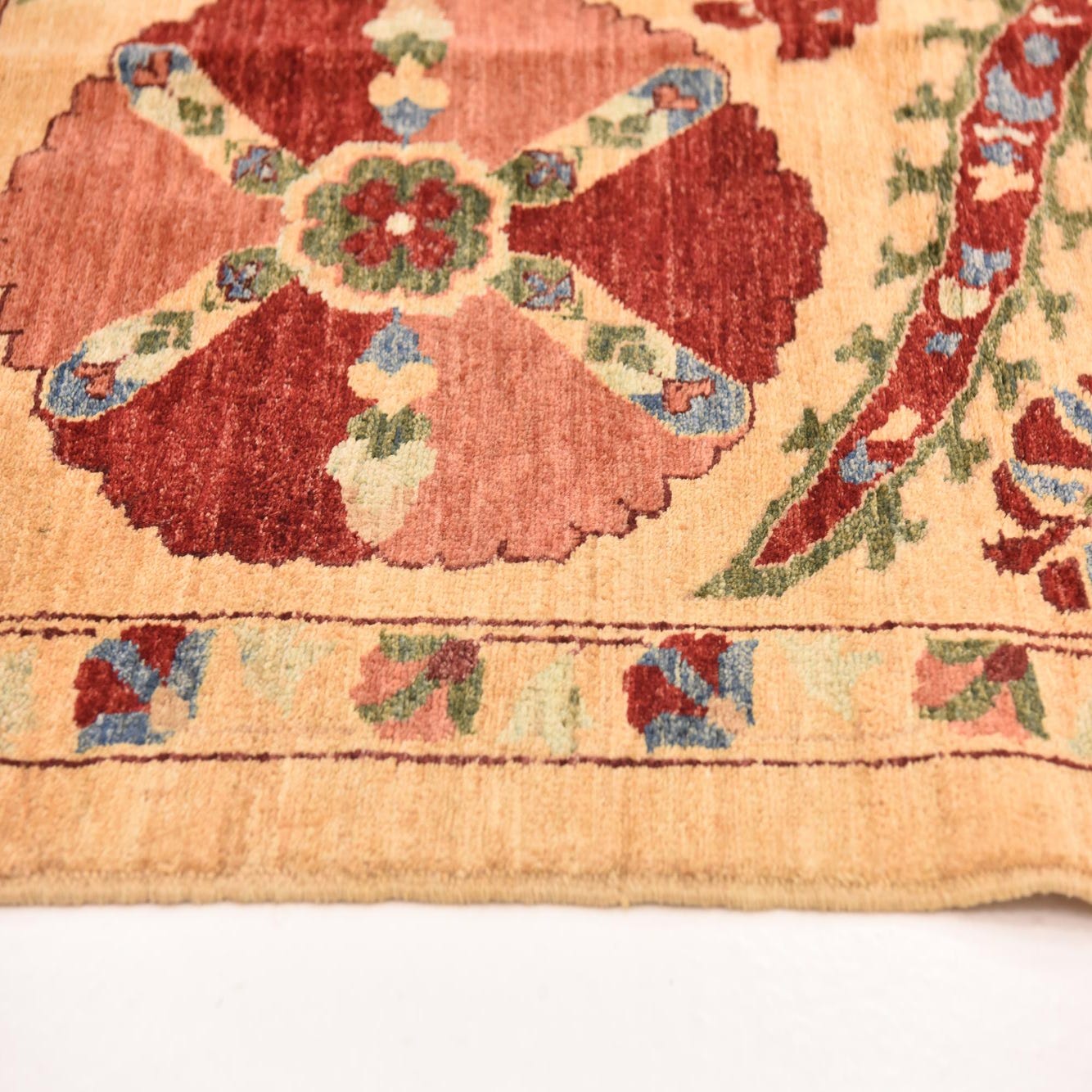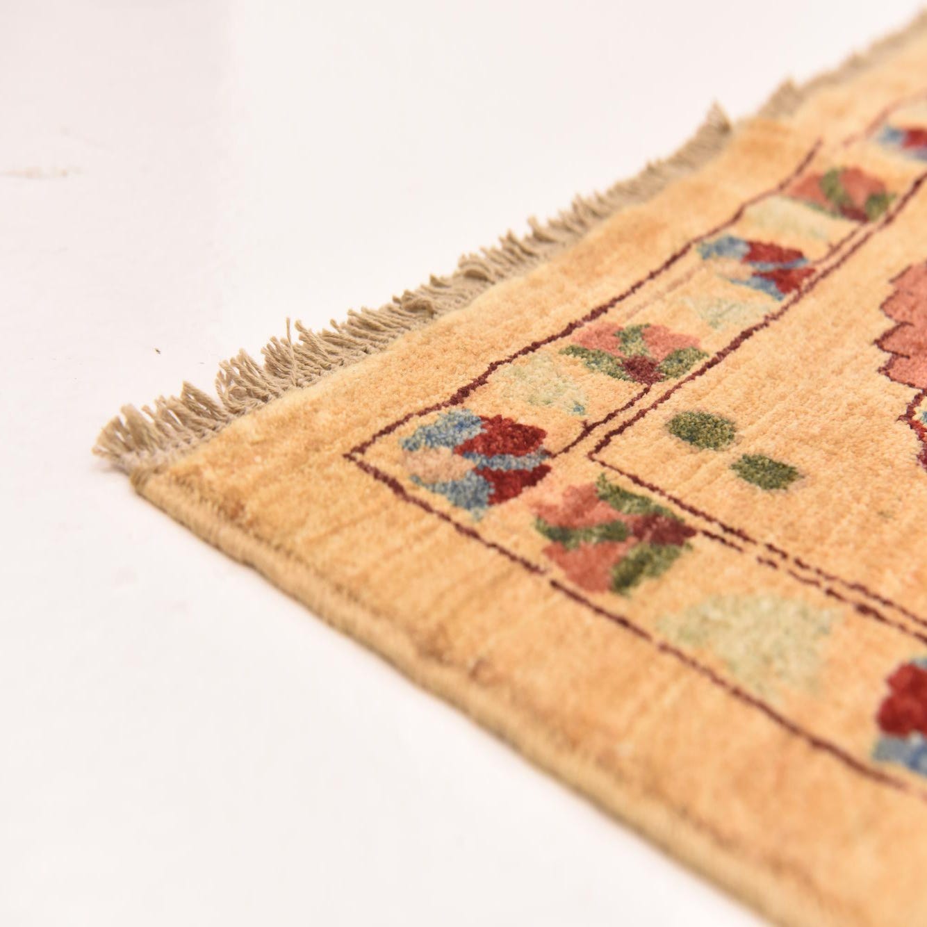 This rug's traditional design and rich color palette make it well-suited to a variety of interior styles. It can effortlessly anchor a formal living room or dining space, adding warmth and elegance. The gold background is versatile enough to complement both dark and light furniture, while the jewel tones can tie in with a range of color schemes. In a more casual setting, it can introduce a sense of timelessness and sophistication. Its textural and visual depth would also serve to enhance the coziness of spaces with an emphasis on classic or antique decor.