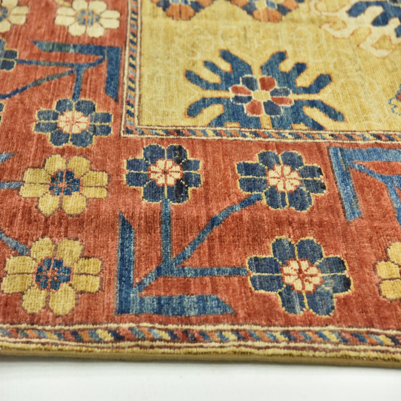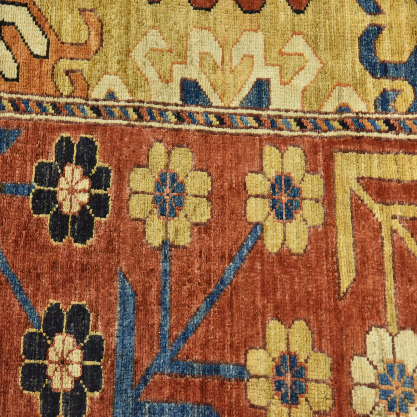 A 7x10 rectangular Kazak rug with a gold field and a rust-red border, featuring traditional botanical and tribal patterns in blue, black, and cream.