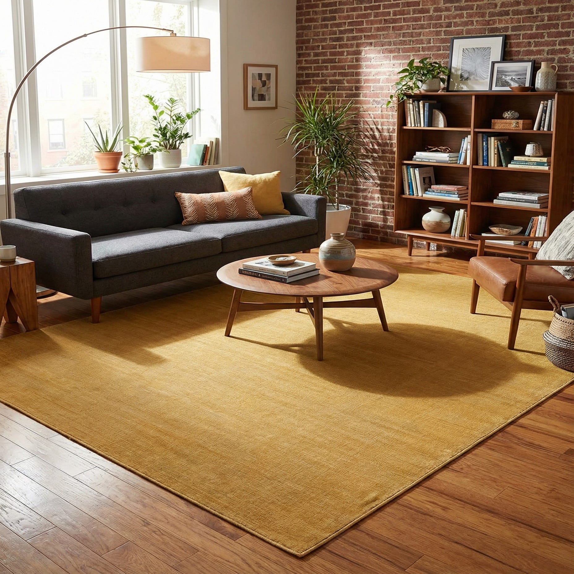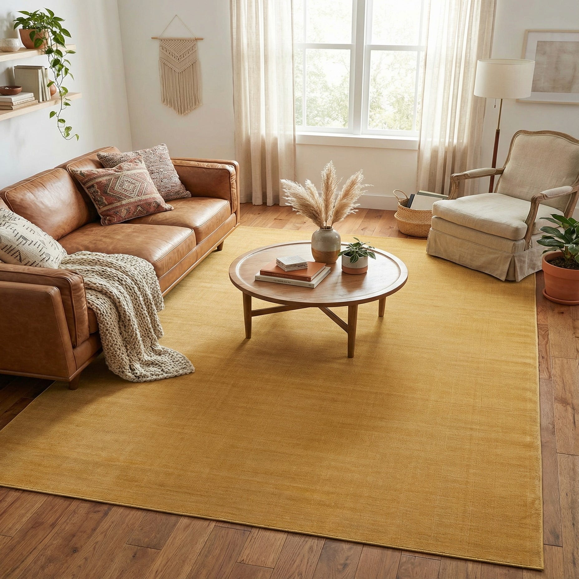 This piece works well where you want warmth and simplicity—place it under a mid-century modern seating group to complement walnut tones, layer it beneath a neutral bedroom set for added depth, or anchor a dining table to introduce a cohesive golden base. Its restrained style pairs nicely with natural woods, matte black accents, and textured linens for a modern, lived-in look.