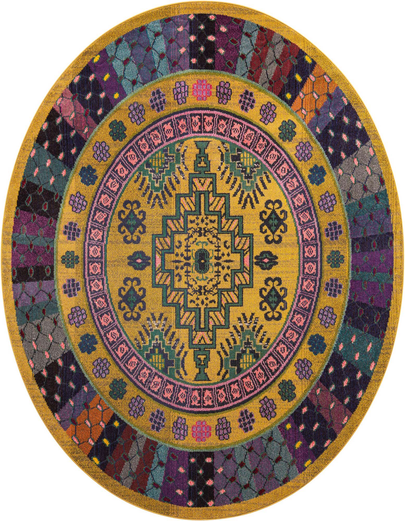 Primary color is Gold. Colors in this rug include: Gold, Blue, Green, Purple, Violet, Pink, Navy Blue.
