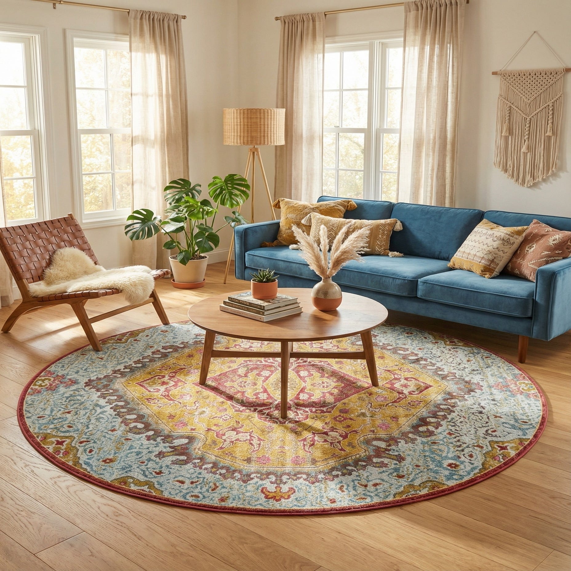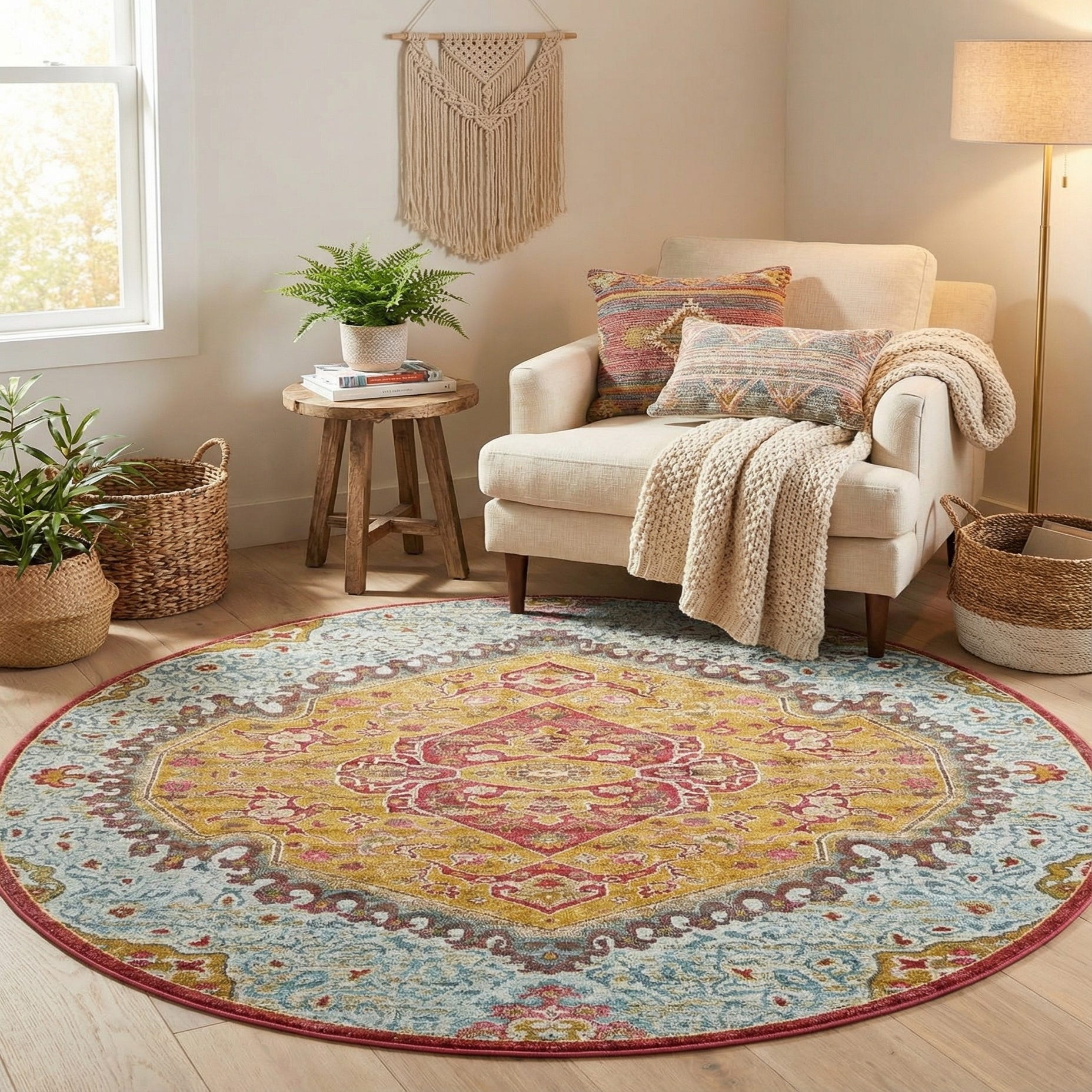 This rug pairs naturally with both traditional and transitional schemes: place it beneath a round dining table to echo its shape, under a coffee table to anchor a seating group, or in a breakfast nook for an inviting pop of color. It complements warm woods, cream upholstery and jewel-toned accents like navy or teal, and also works in eclectic or bohemian settings where layered patterns and mixed textures are welcome.