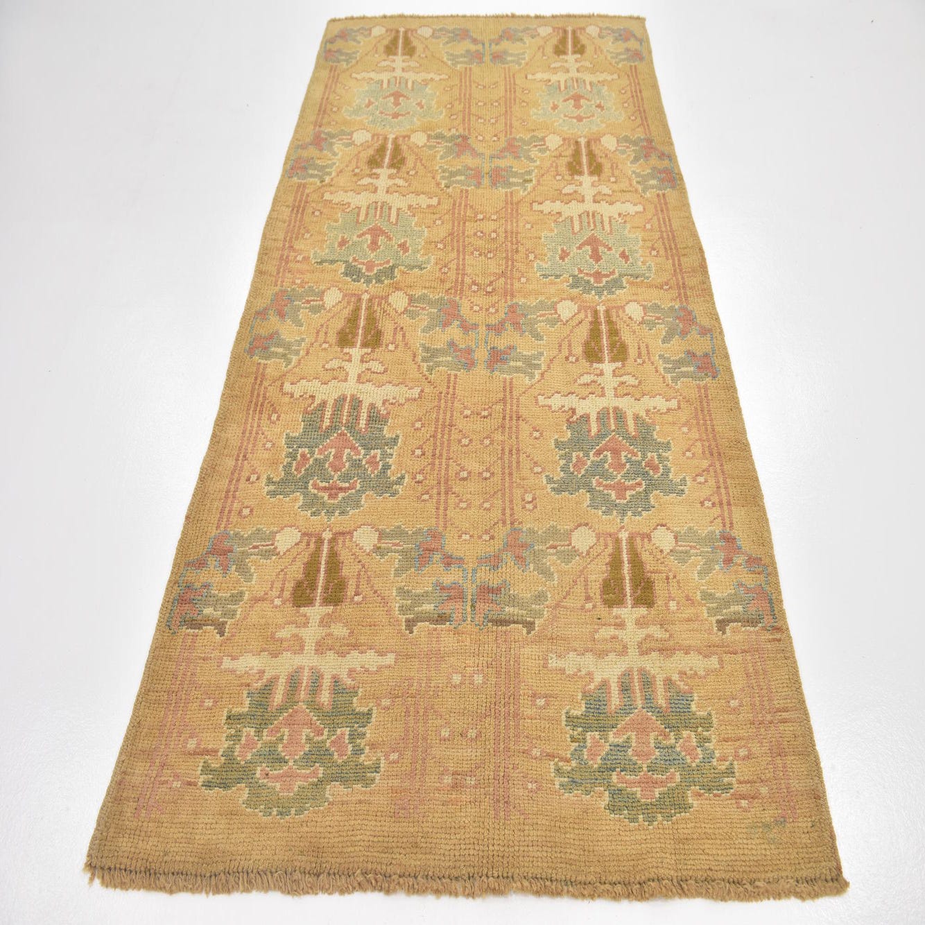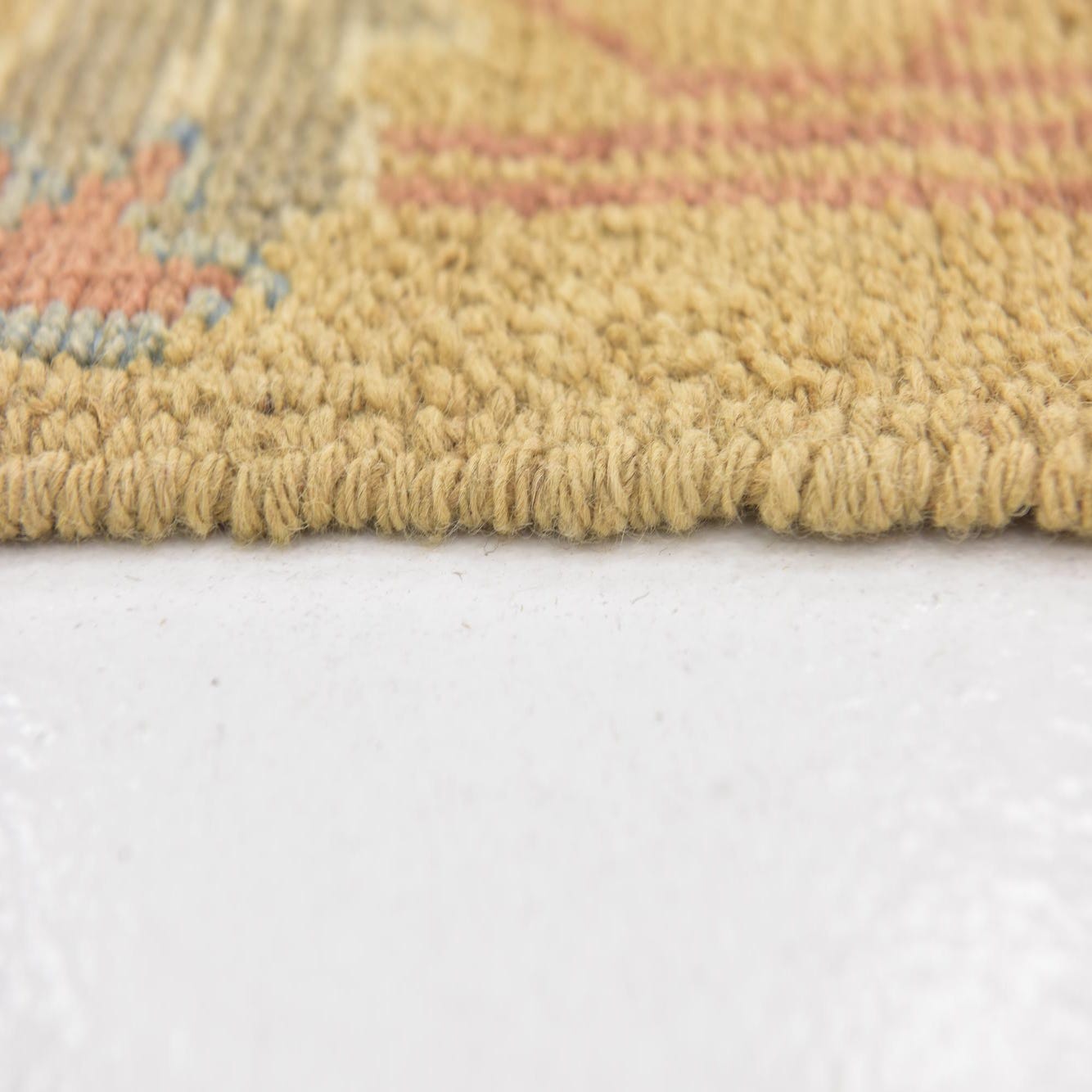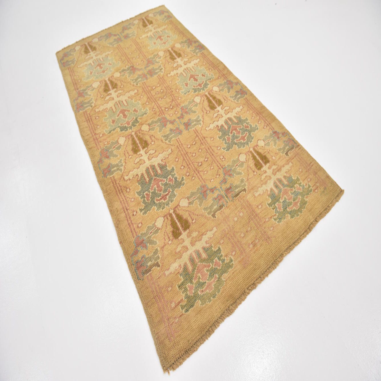 Primary color is Gold. Colors in this rug include: Gold, Blue, Cream, Green, Peach, Tan.