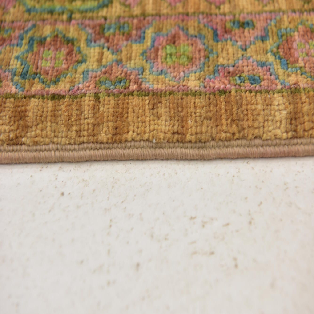 Primary color is Gold. Colors in this rug include: Gold, Beige, Blue, Green, Orange, Red, Olive.