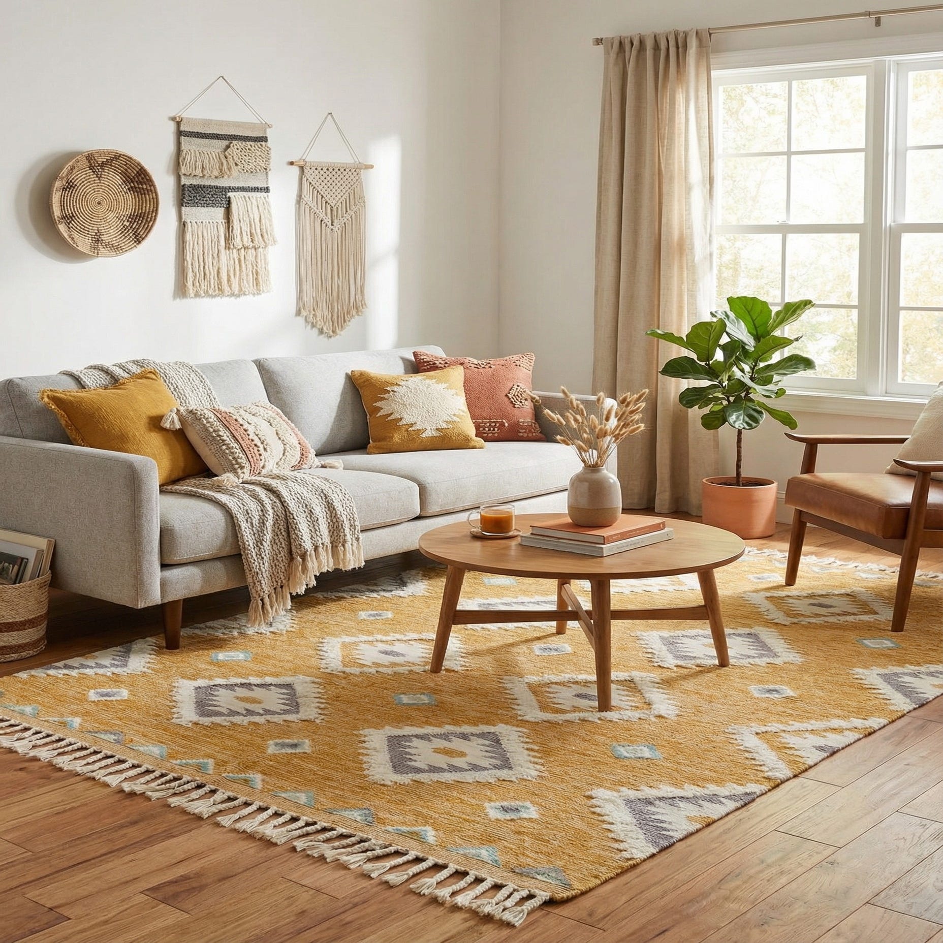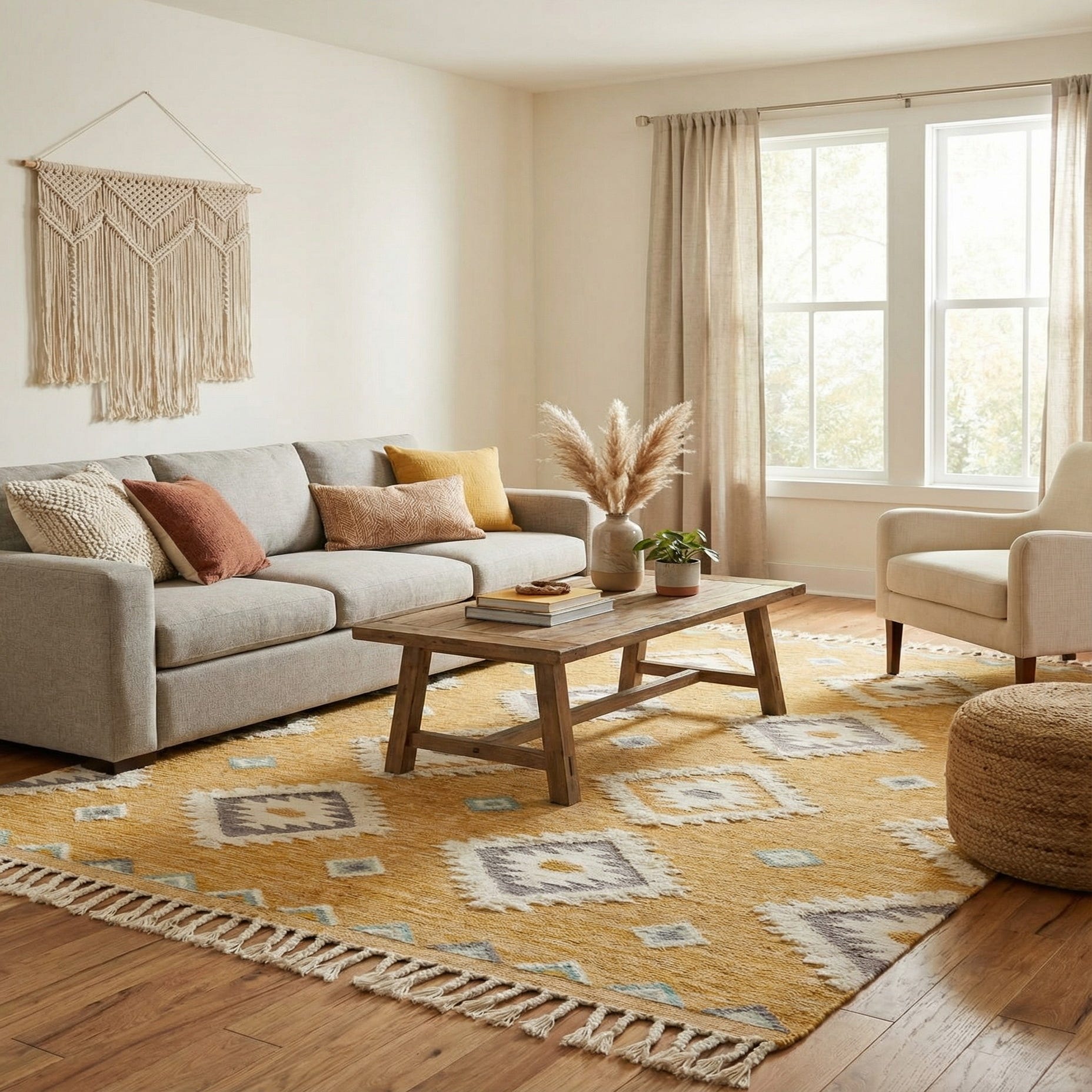 Hand-woven of 100% wool, the surface has a soft, slightly nubby hand with low-relief cream motifs that add subtle texture underfoot. The wool pile gives the colors a gentle depth, so the gold background feels rich but grounded. This rug works well anchored beneath a living room seating area to warm neutral sofas, layered in a bohemian bedroom with rattan and woven accents, or placed under a dining table where natural-wood furniture and brass or matte-black hardware can play off the gray and blue highlights.