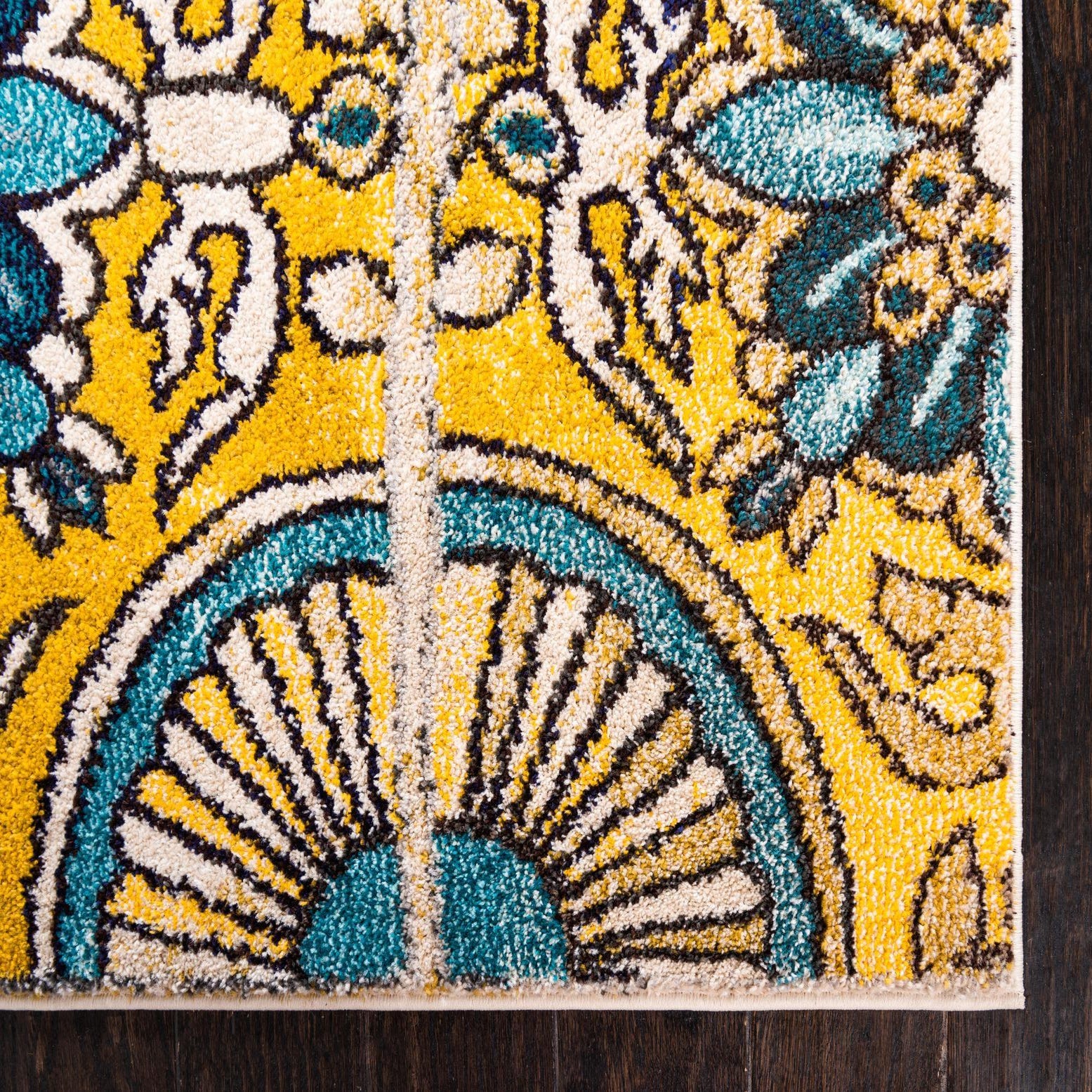 Primary color is Gold. Colors in this rug include: Gold, Blue, Navy Blue, Beige, Brown.