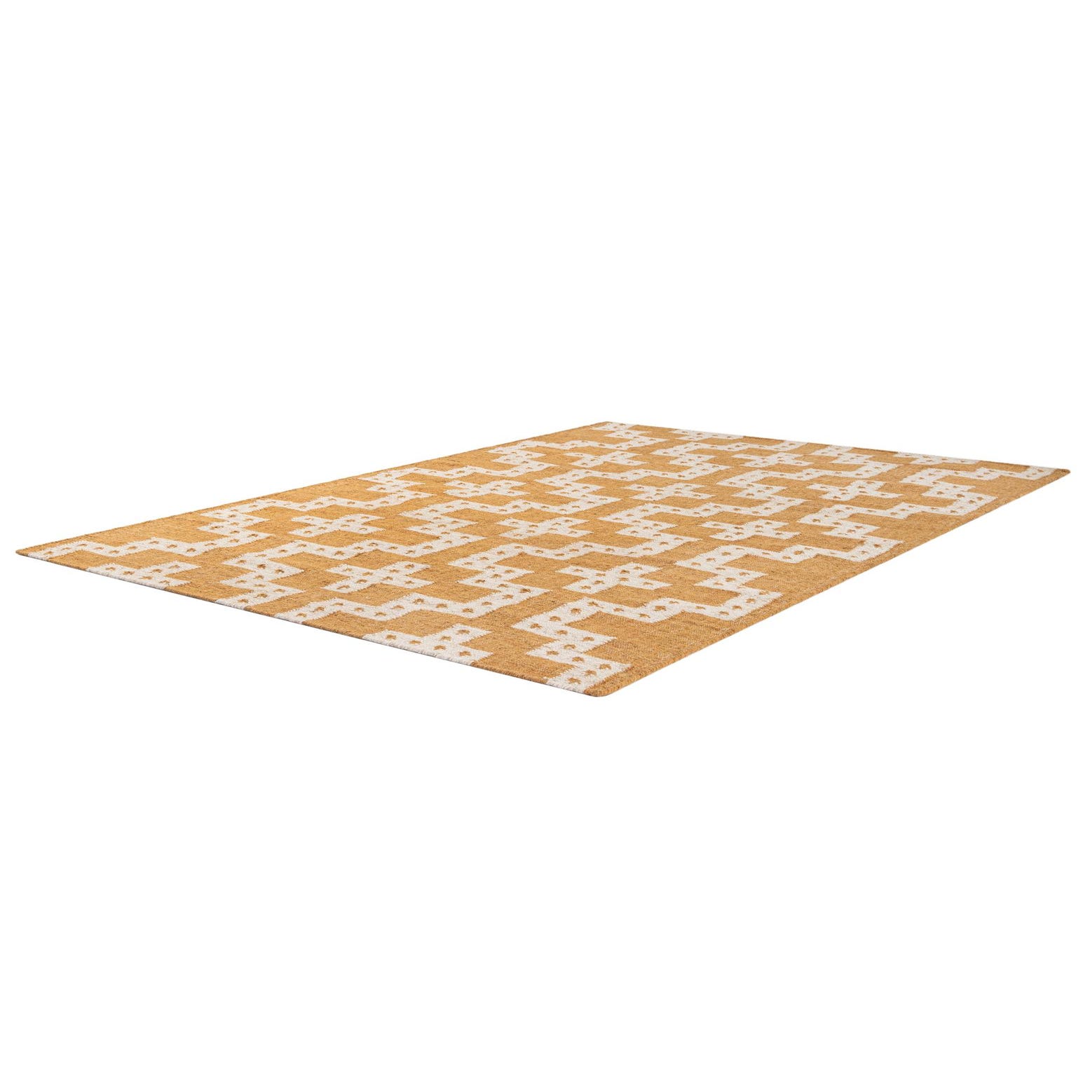 A 5x8 rectangular Kilim Wool rug featuring a tribal geometric pattern in ivory and gold, suitable for a living room.