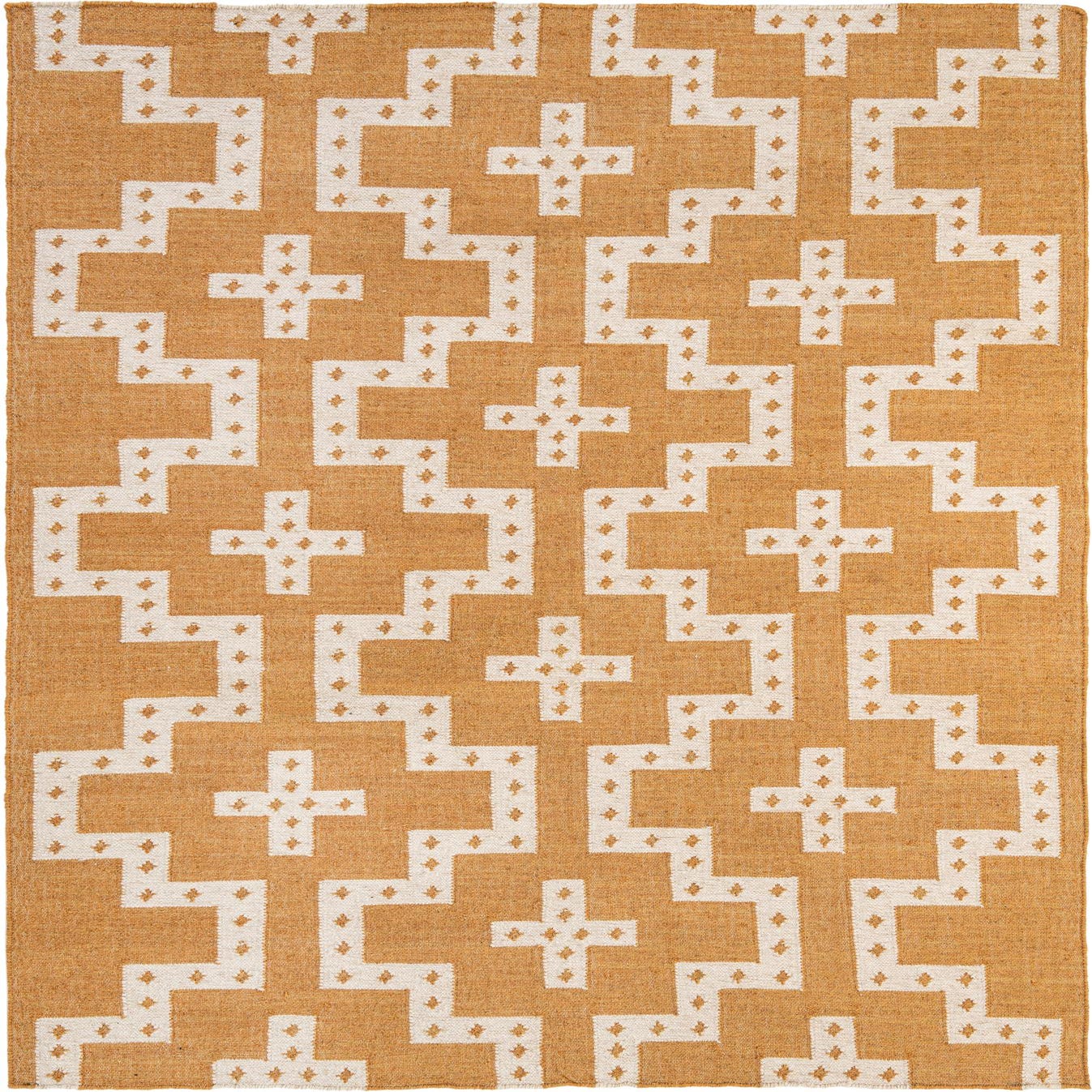 A 6x9 rectangular Kilim Wool rug featuring a bold tribal geometric pattern in ivory and gold.