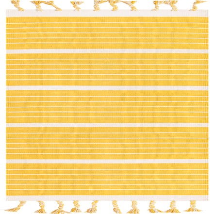 Clean, horizontal striping gives this runner a fresh, modern look: narrow white lines alternate with wider bands of warm gold, interrupted by a few broader white bands for visual rhythm. Braided tassels at each end add a casual, handcrafted touch. Hand Woven of 100% Cotton, the flatweave surface lies low to the floor and has a smooth yet tactile feel from the natural fibers — light underfoot with a noticeable woven texture that invites touch.