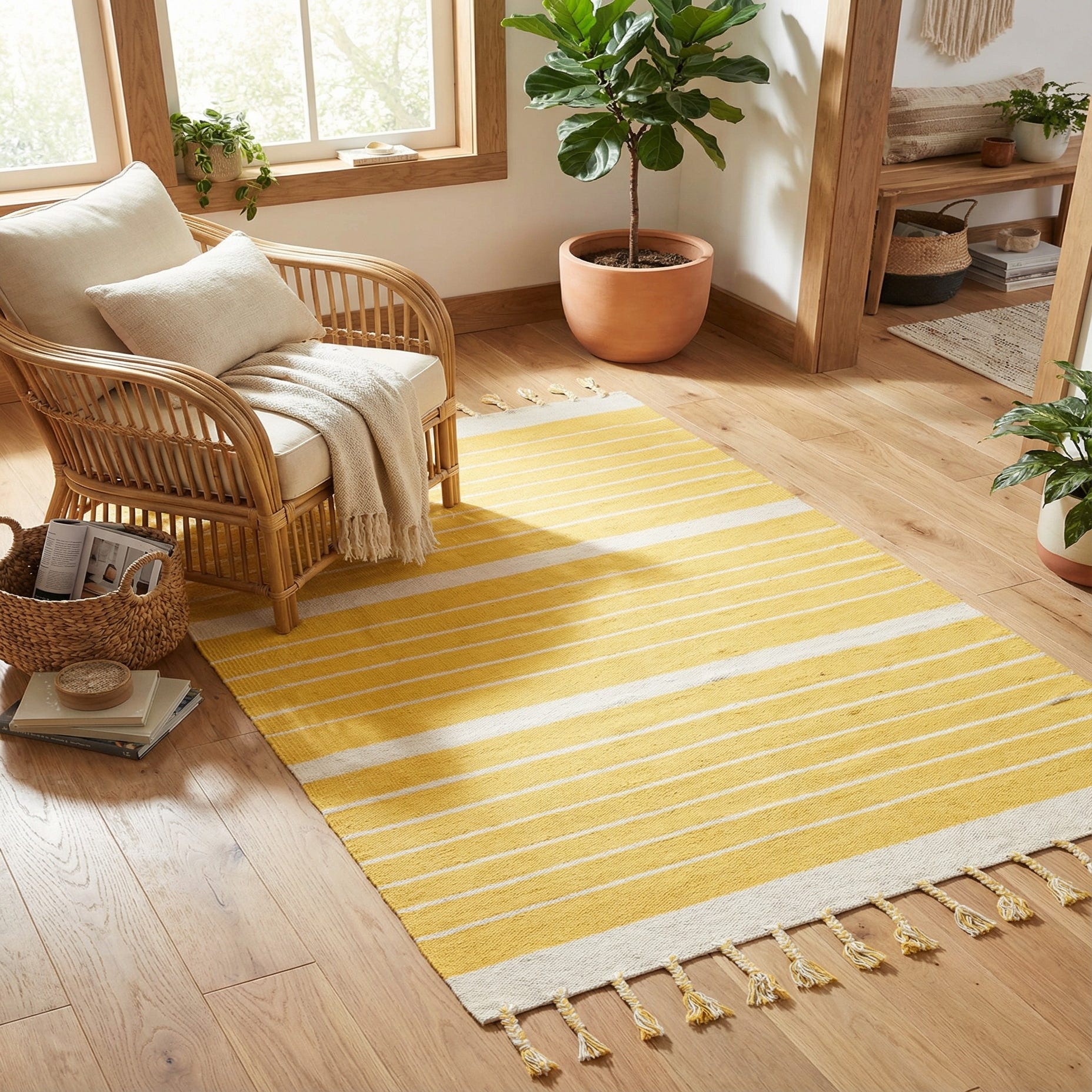 A clean, hand-woven stripe pattern gives this cotton rug a fresh, casual look. Bands of warm gold alternate with crisp white pinstripes and two broader white bands, creating a balanced, horizontal rhythm across the weave. Hand woven of 100% cotton, the flatweave surface has a low profile and a slightly textured, natural hand that feels soft underfoot. Twisted tassel fringe in matching gold and white finishes each end for a relaxed, crafted detail.