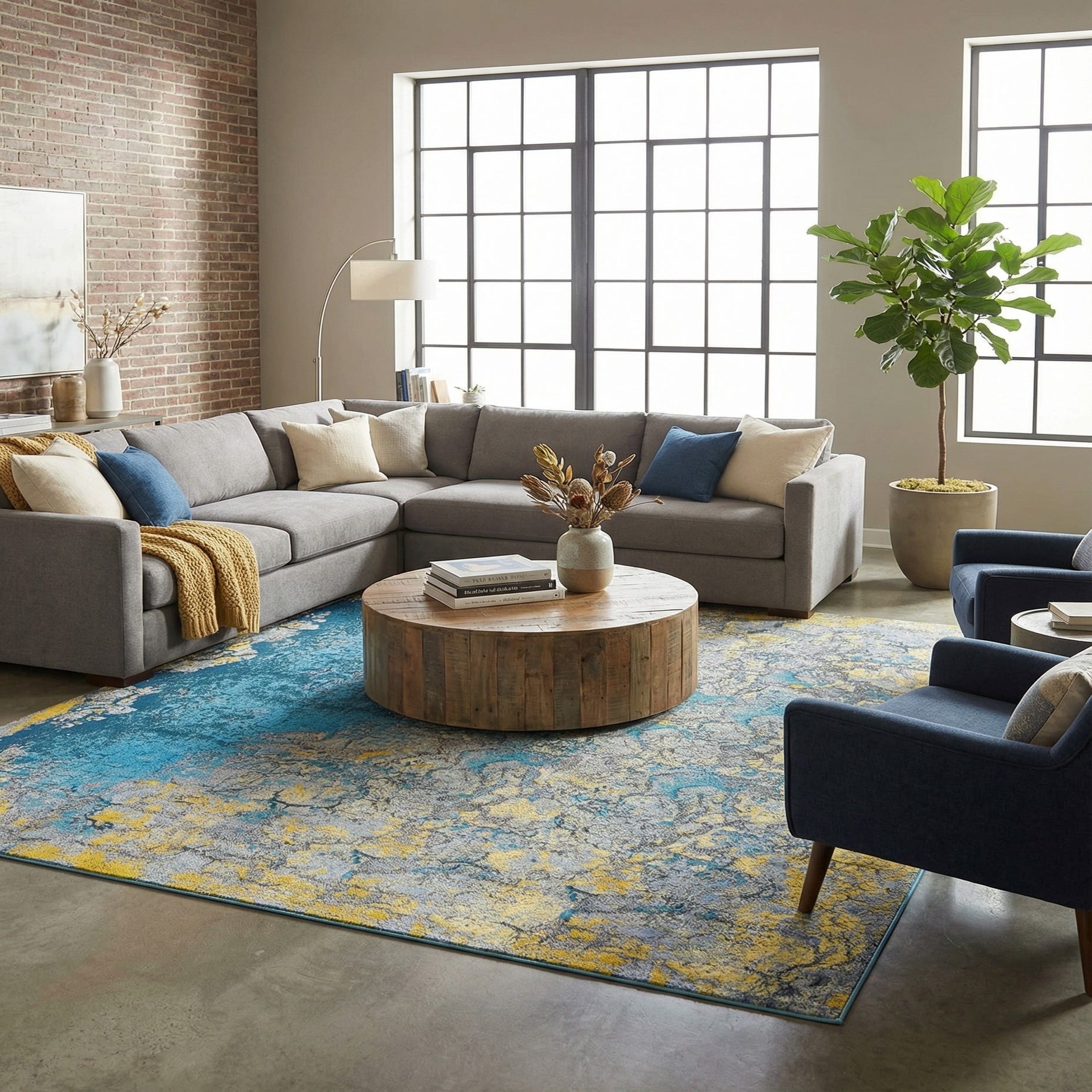 Underfoot the surface is low and tightly woven, offering a smooth but subtly textured hand that works well in both covered outdoor spaces and busy indoor rooms. Pair it with modern coastal decor—navy or white upholstery and light wood finishes—or use it to warm a contemporary industrial scheme alongside metal and concrete accents. It also functions well as a color anchor for a sunroom or patio seating area, or beneath a coffee table to introduce layered blues and a pop of yellow.