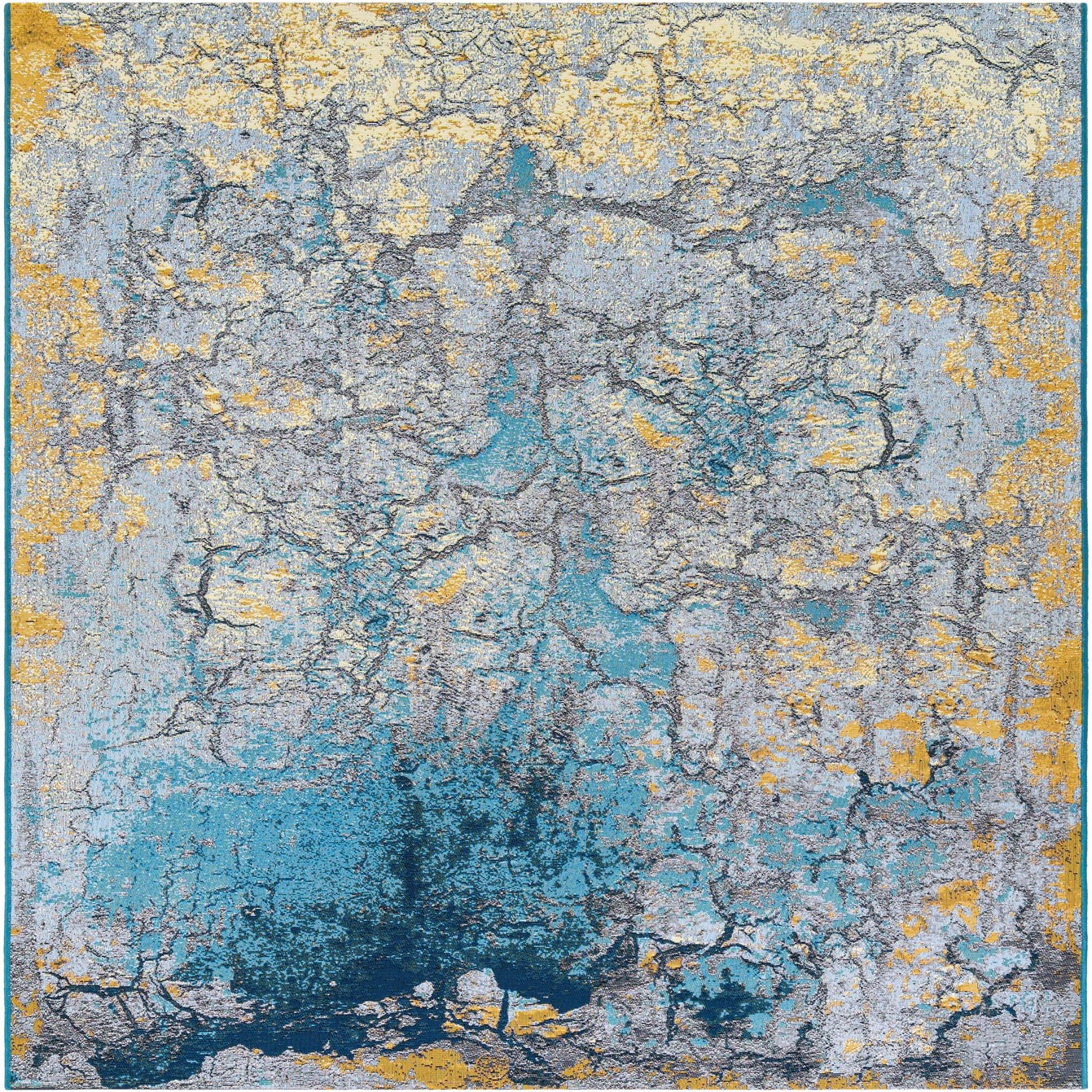 An abstract, weathered pattern unfolds across a Gradient Blue background, where veins of Navy Blue, Black and Gray trace organic, cracked lines that give the surface a layered, painterly quality. Pockets of Ivory and warm Yellow interrupt the cool tones, creating contrast and visual movement that reads like aged plaster or mineral-rich terrain. The overall style is modern-abstract with a gently distressed feel; the design delivers depth and character without feeling busy.