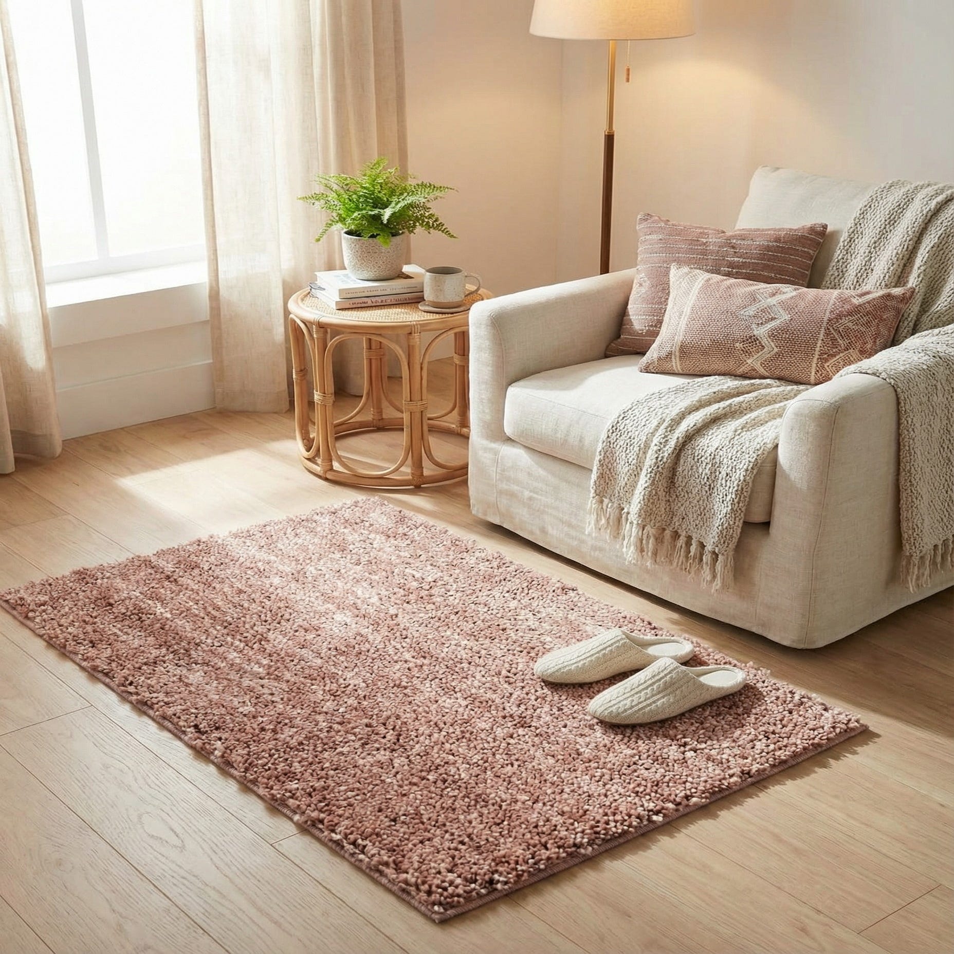 A warm grapefruit pink field is softened by space-dyed polyester yarn into a plush, tonal shag that invites bare feet. The surface is high-pile and densely packed, offering a cushiony, tactile feel with gentle highlights and lowlights created by the yarn’s color variation. Machine-made from 100% polyester (space-dyed yarn), this piece presents a uniform, cozy texture with a simple, solid look that reads as contemporary shag rather than a patterned rug.
