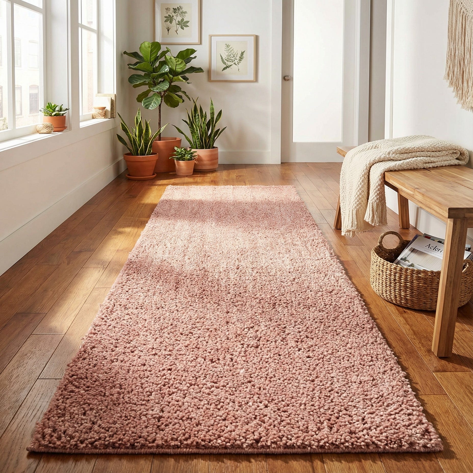 This runner-style piece works well in narrow or transitional areas that benefit from a soft underfoot layer: hallways, beside beds, dressing areas, or a powder room. It pairs naturally with light- to medium-tone woods, warm neutrals, and brass or matte black accents, and complements interiors ranging from modern glam and contemporary to soft Scandinavian or boho-chic schemes. Use it to soften hard flooring, introduce a muted color accent, or layer with a larger neutral rug for added texture and warmth.
