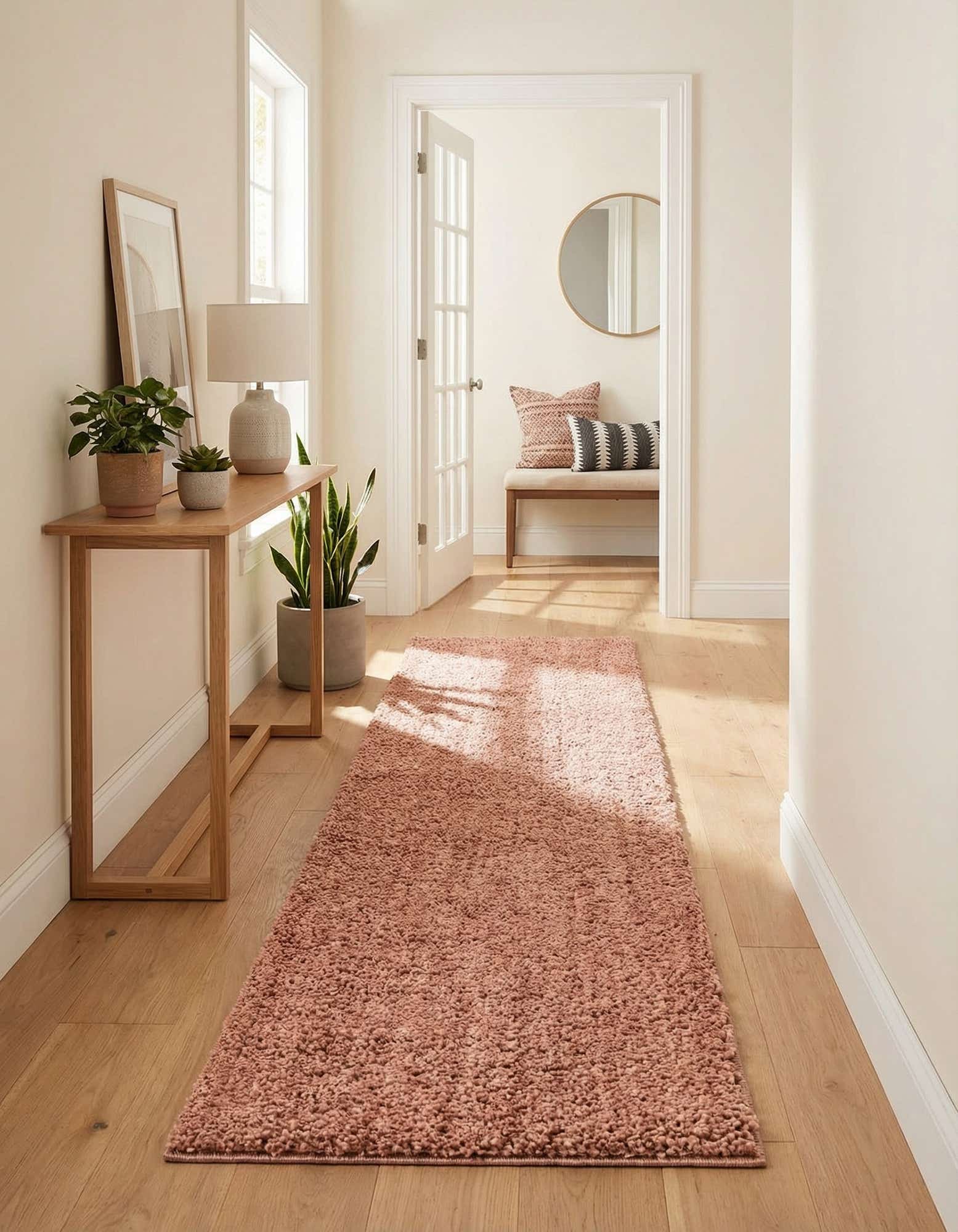 A soft, plush 8 ft runner rug in a solid pink color, featuring a shaggy texture, ideal for a hallway.