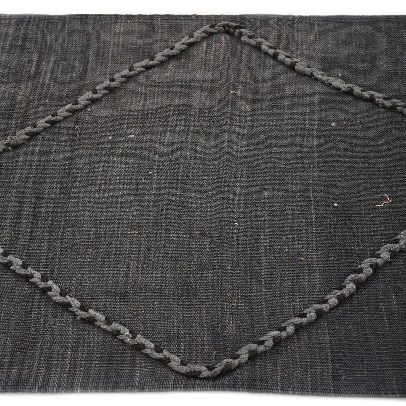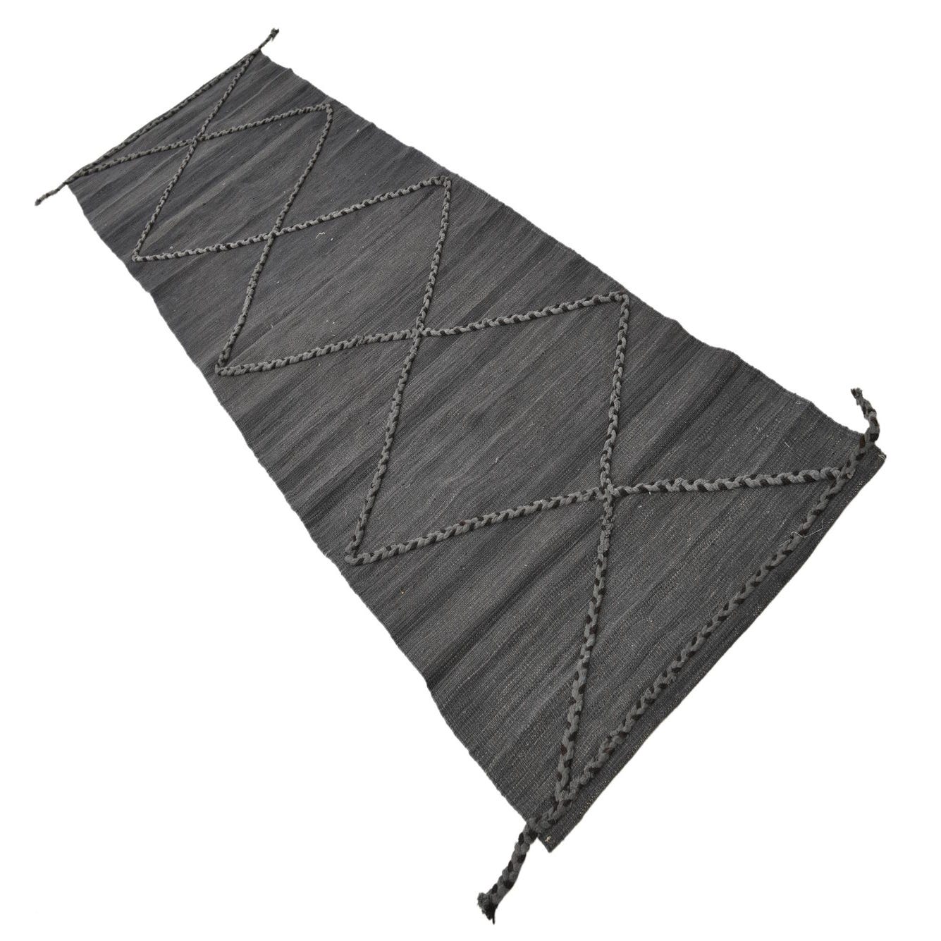 A 10 ft runner rug from the Kilim Modern collection, featuring a dark gray flatweave with a textured tribal diamond pattern.