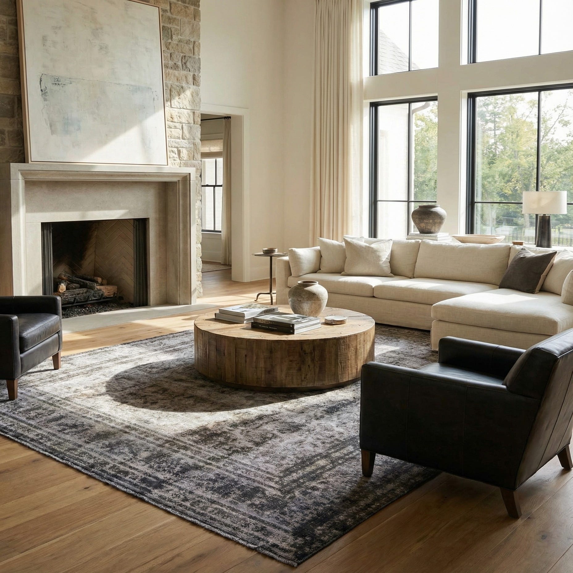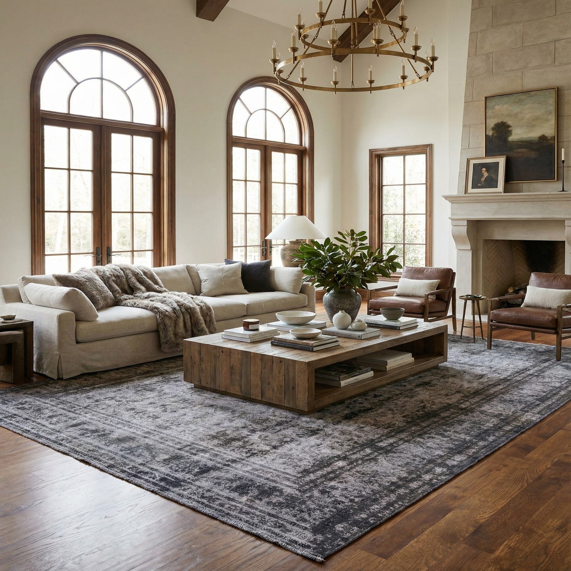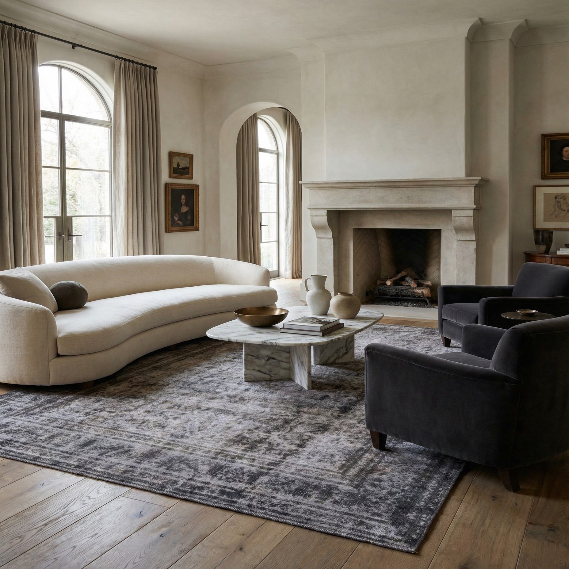 Thanks to its neutral and subdued color scheme, this piece is particularly well suited for anchoring living spaces, dining areas, or large bedrooms where a refined aesthetic is desired. It would blend harmoniously with minimalist, Scandinavian, or industrial interiors, providing a soft contrast without overpowering the room. Its size makes it ideal for larger rooms where it can serve as a focal point or a unifying element to bring together various pieces of furniture.