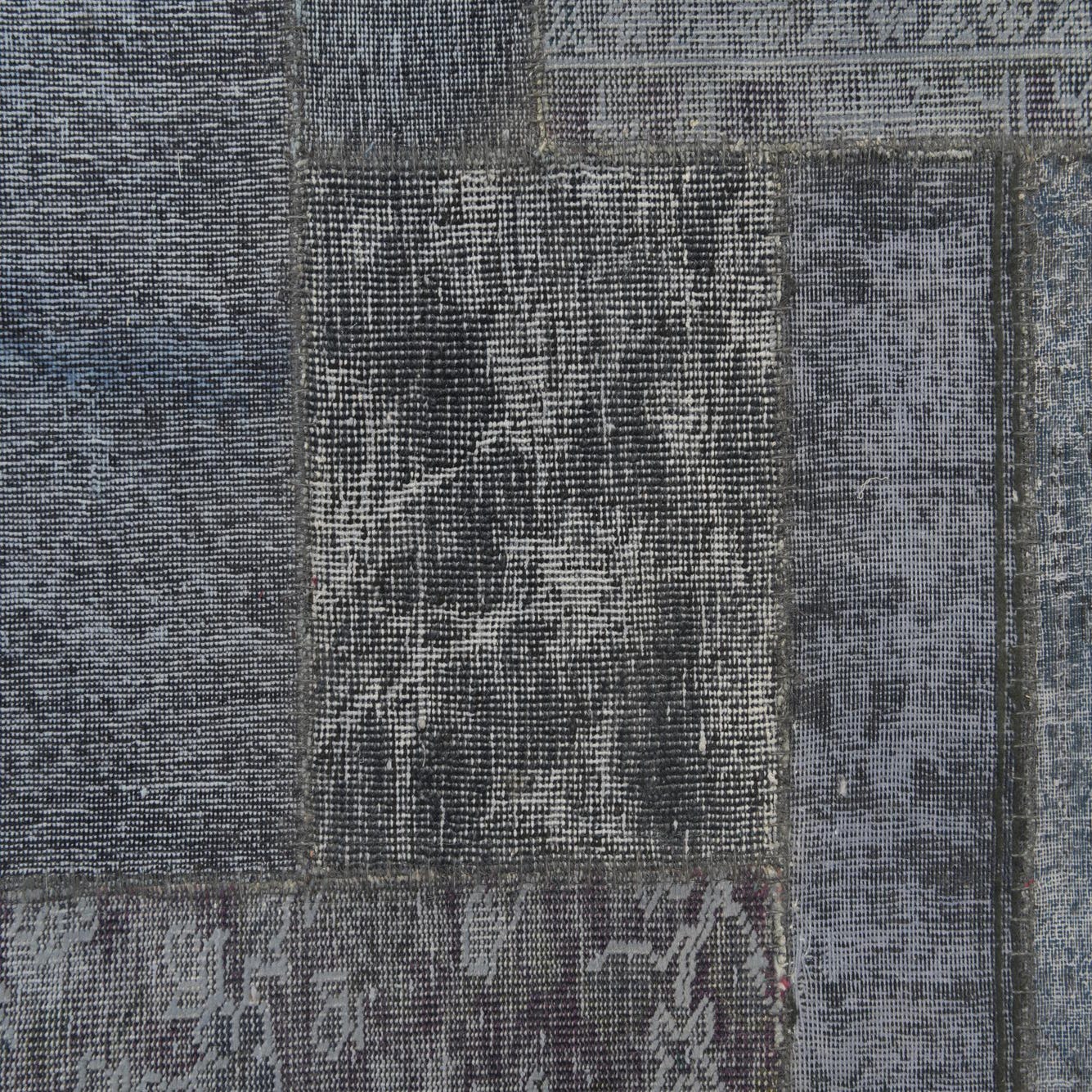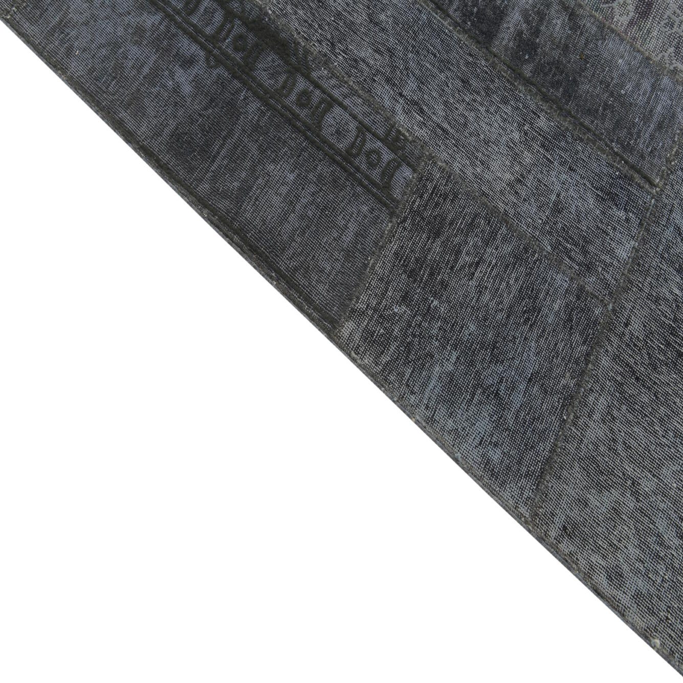 This Ultra Vintage collection rug is a 10x14 hand-knotted piece, meticulously crafted from 100% wool. The rug's surface showcases a patchwork of varied traditional patterns, unified by a cohesive palette of graphite gray, black, and gray tones. Its background in graphite gray offers a versatile canvas that complements the rug's diverse textures and designs.