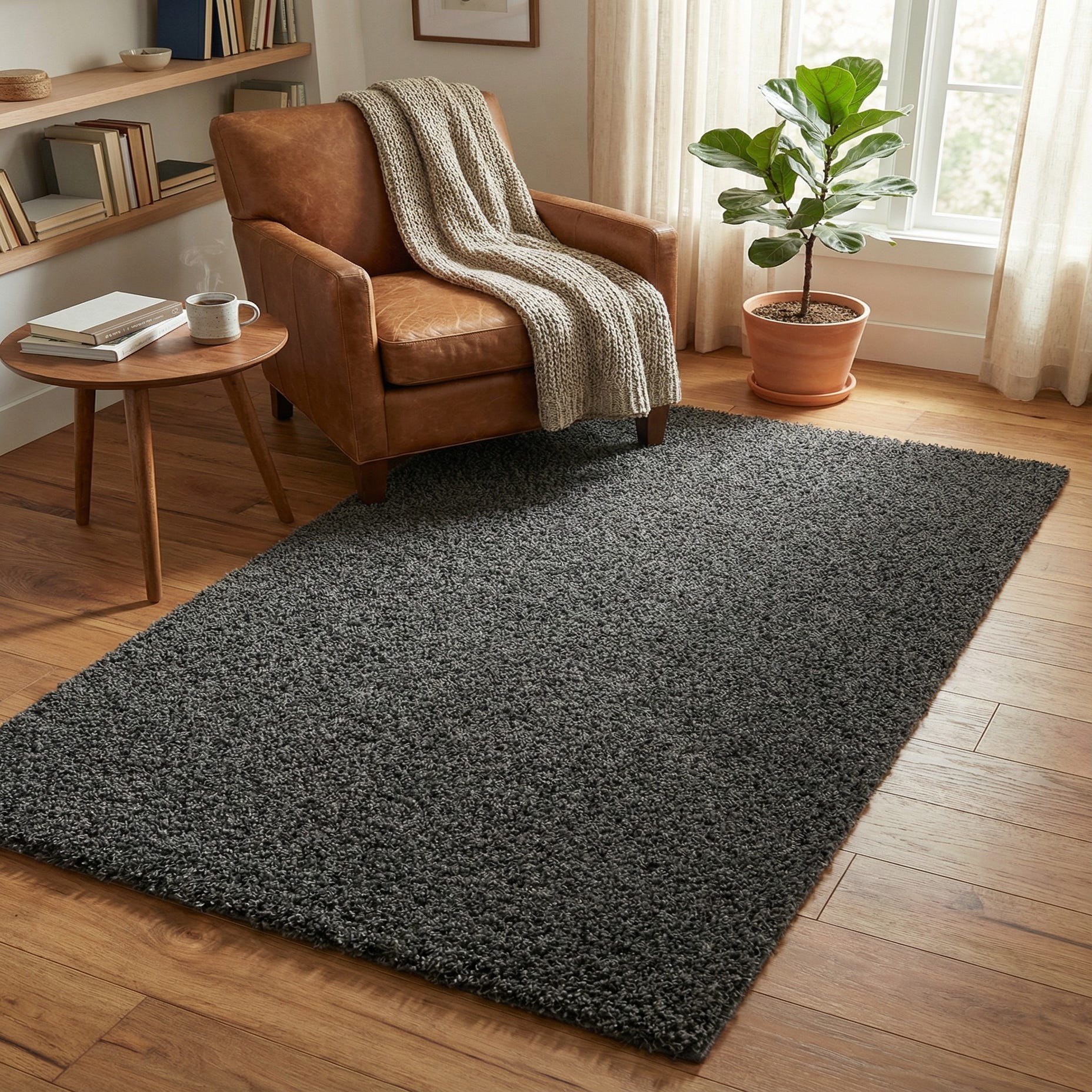 This rug pairs easily with lighter upholstery to create contrast, or with warm wood tones and metal accents for a contemporary-industrial scheme. It works well as a cozy anchor for a seating area, beside the bed in a bedroom, or layered in a reading nook to add softness and depth to hardwood or tile floors.
