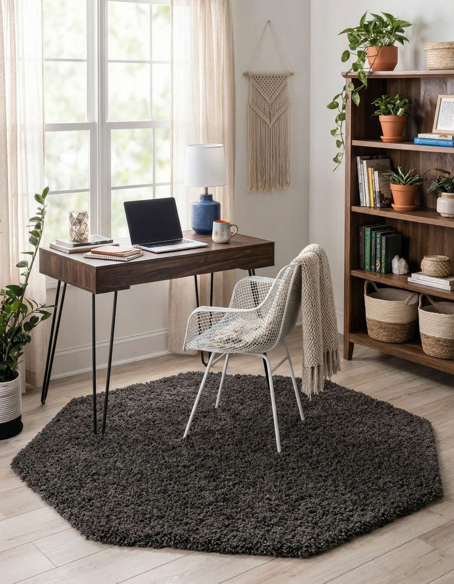This octagonal shag rug carries a clean, single-color look in deep Graphite Gray that fits easily into a range of interiors. Machine-made from 100% polypropylene, the dense, long-cut fibers create a plush, cushiony surface with a gentle low-luster that catches light without appearing shiny. The solid pile gives an inviting, tactile feel underfoot while the uniform construction keeps the surface visually simple and modern.