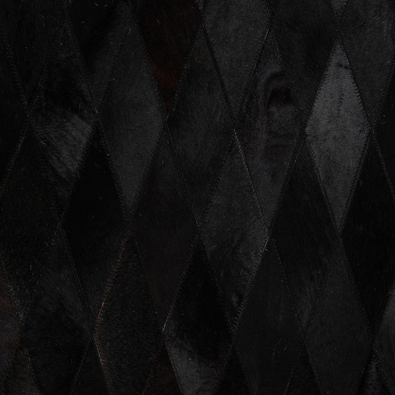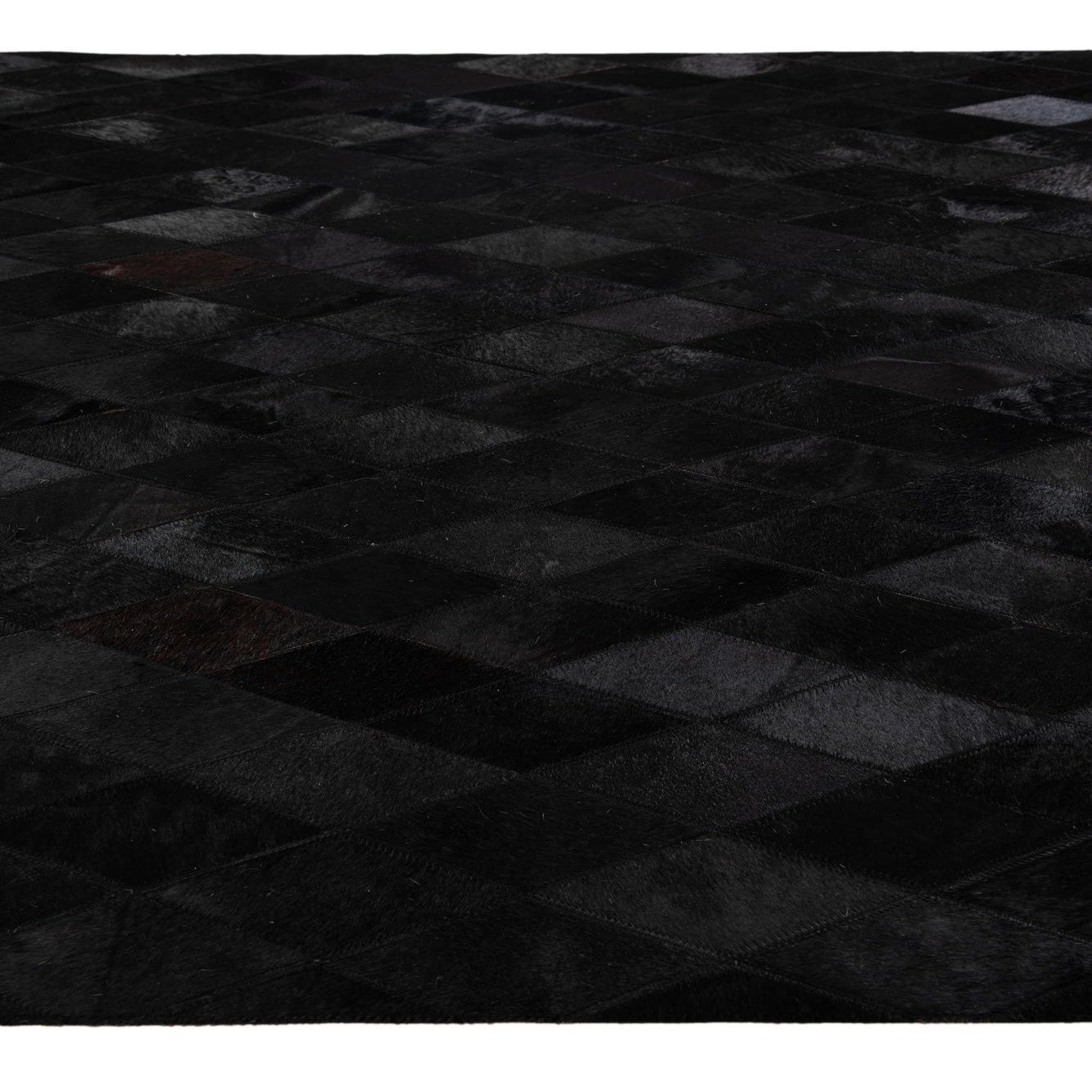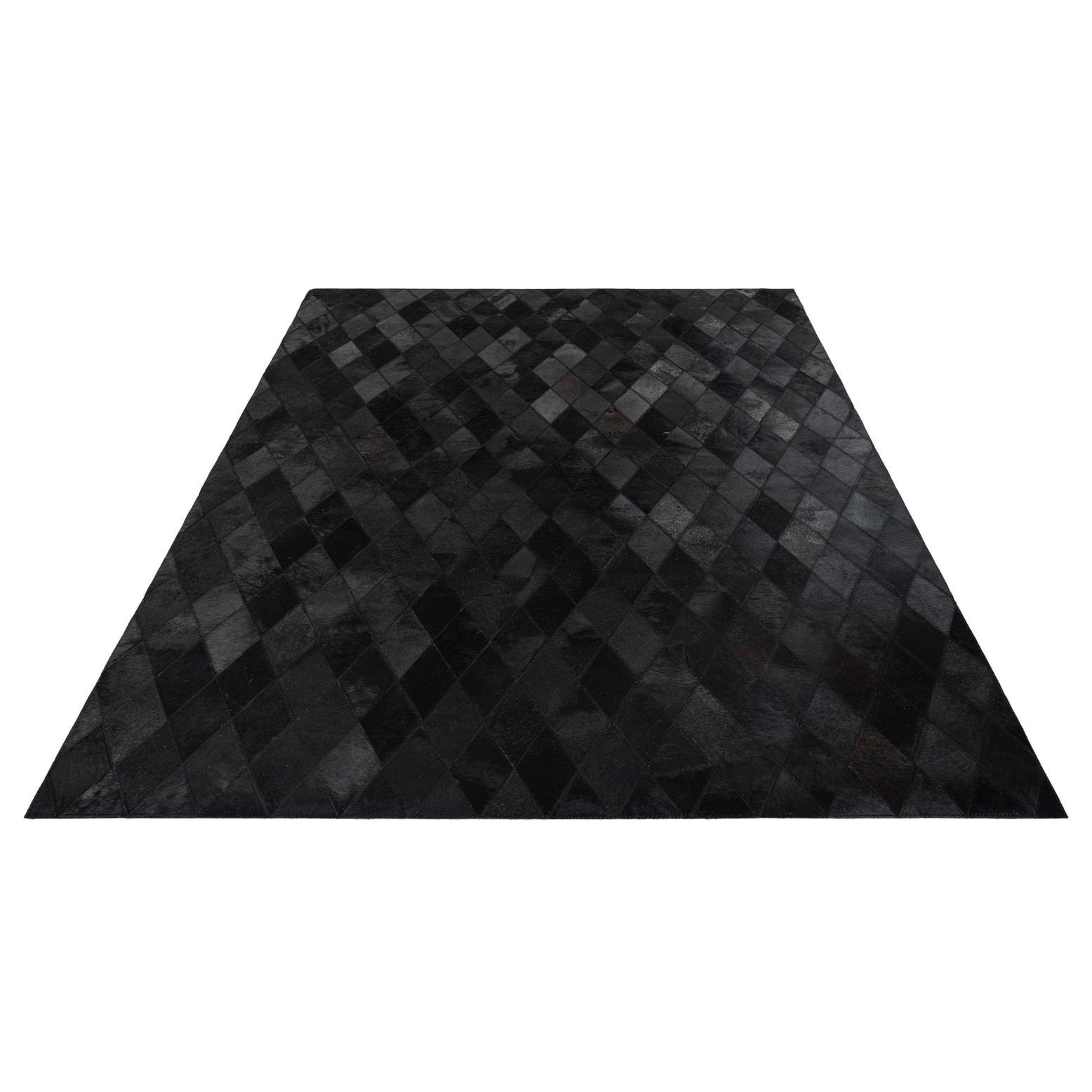 Hand made of cowhide and leather, this rug presents a refined diamond patchwork set against a graphite gray background. Alternating tiles of deep black and warm brown form a subtle geometric pattern, while the hair-on-hide surface provides a low, tactile nap with a soft sheen. Natural variations in each hide create gentle shifts in tone and texture that add depth without busying the overall layout.