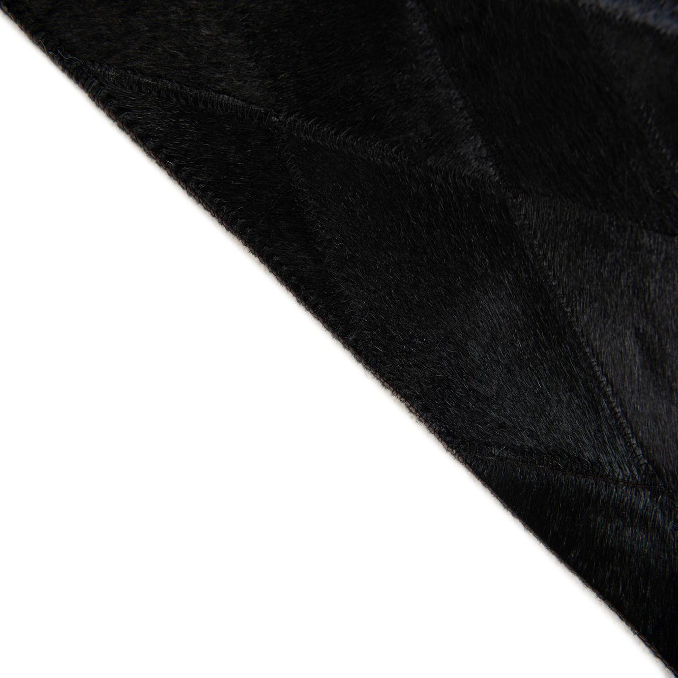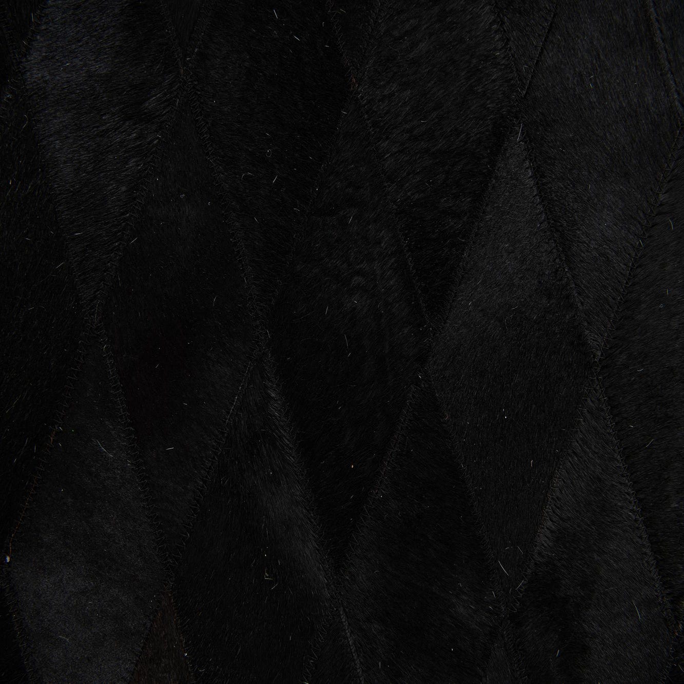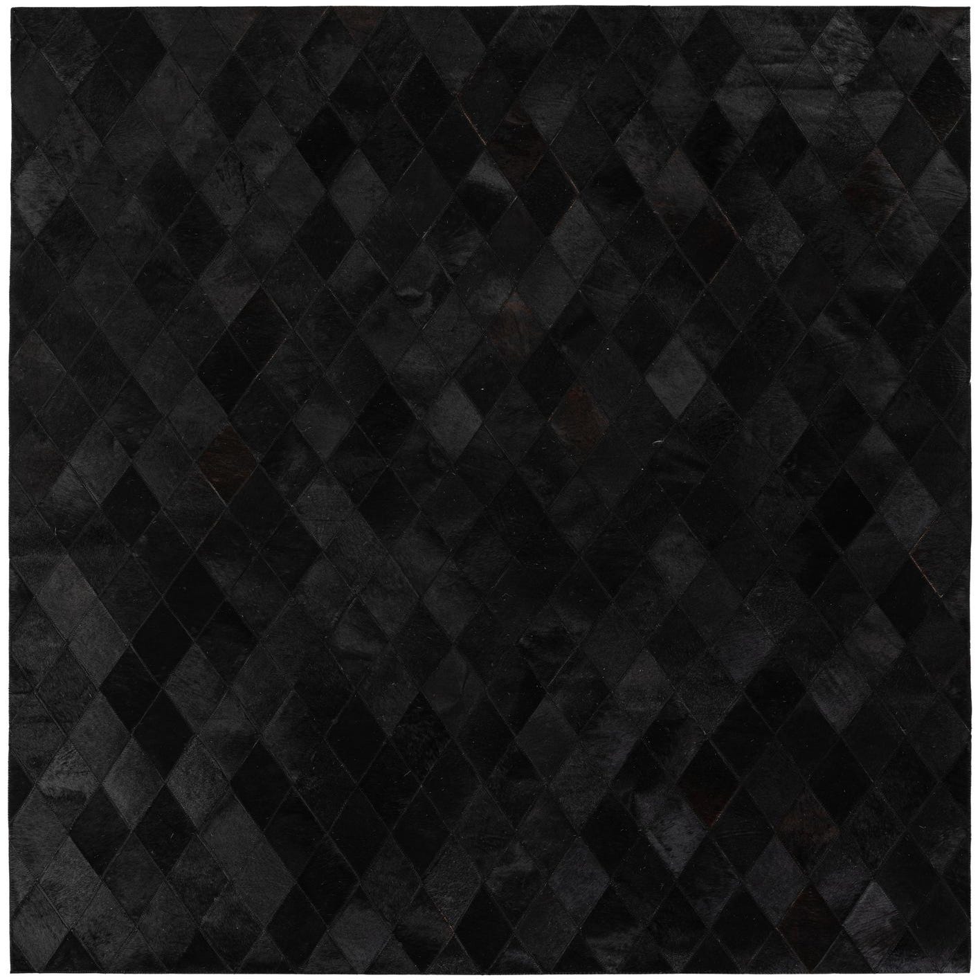Hand made of cowhide and leather, this rug presents a refined diamond patchwork set against a graphite gray background. Alternating tiles of deep black and warm brown form a subtle geometric pattern, while the hair-on-hide surface provides a low, tactile nap with a soft sheen. Natural variations in each hide create gentle shifts in tone and texture that add depth without busying the overall layout.