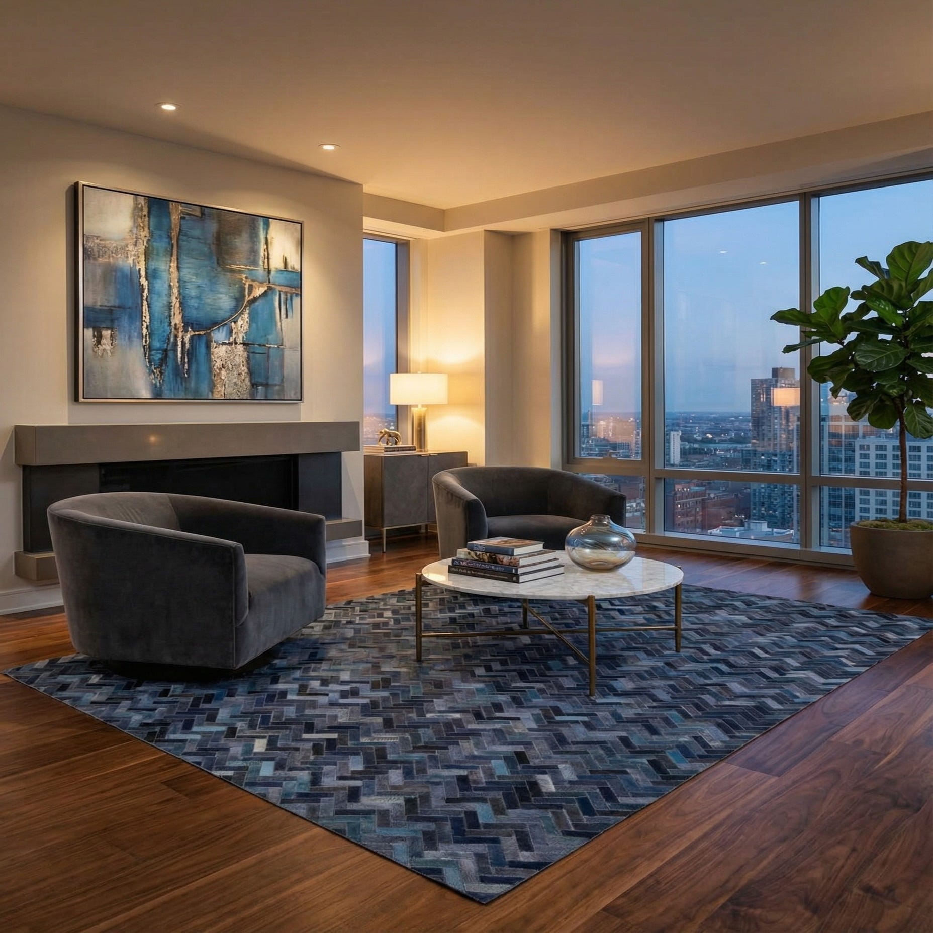 A 5x8 rectangular Cowhide rug featuring a modern herringbone pattern in various shades of gray and silver.