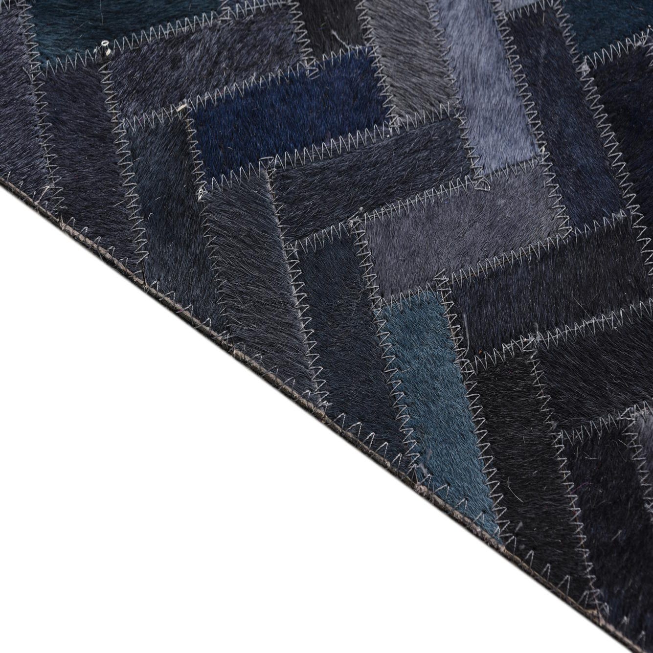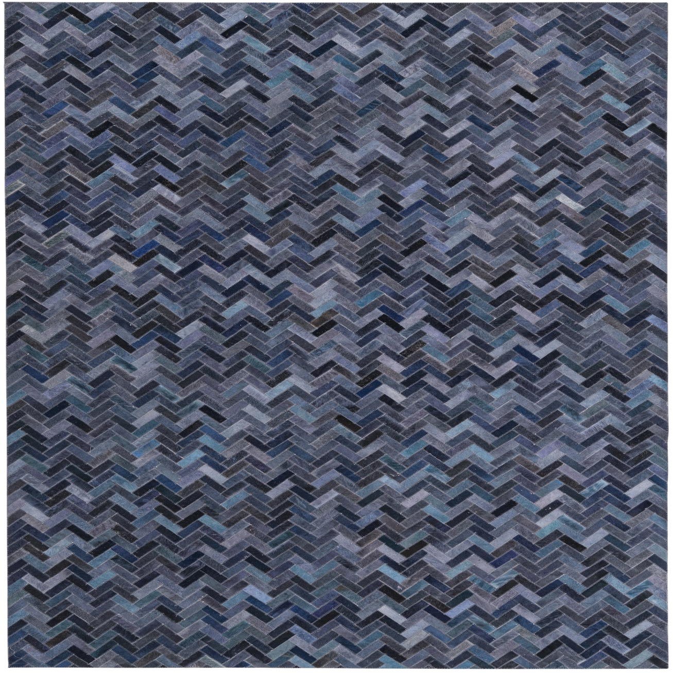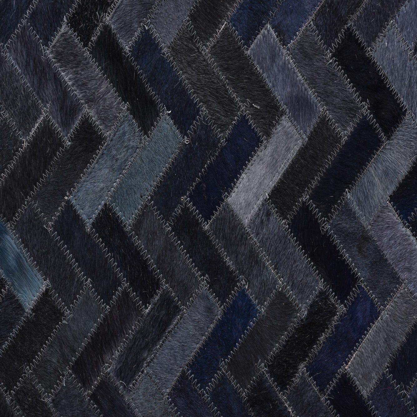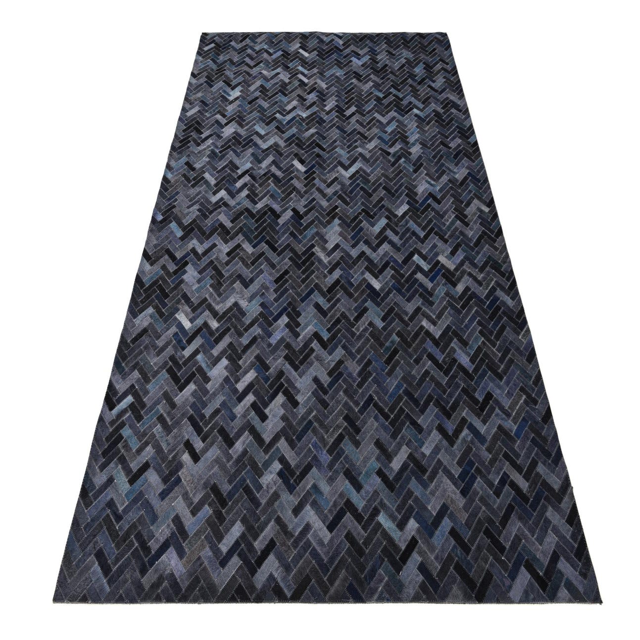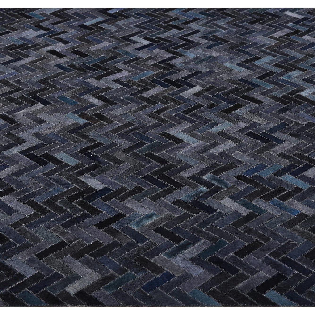 A 5x8 rectangular Cowhide rug featuring a modern herringbone pattern in varying shades of gray and silver.