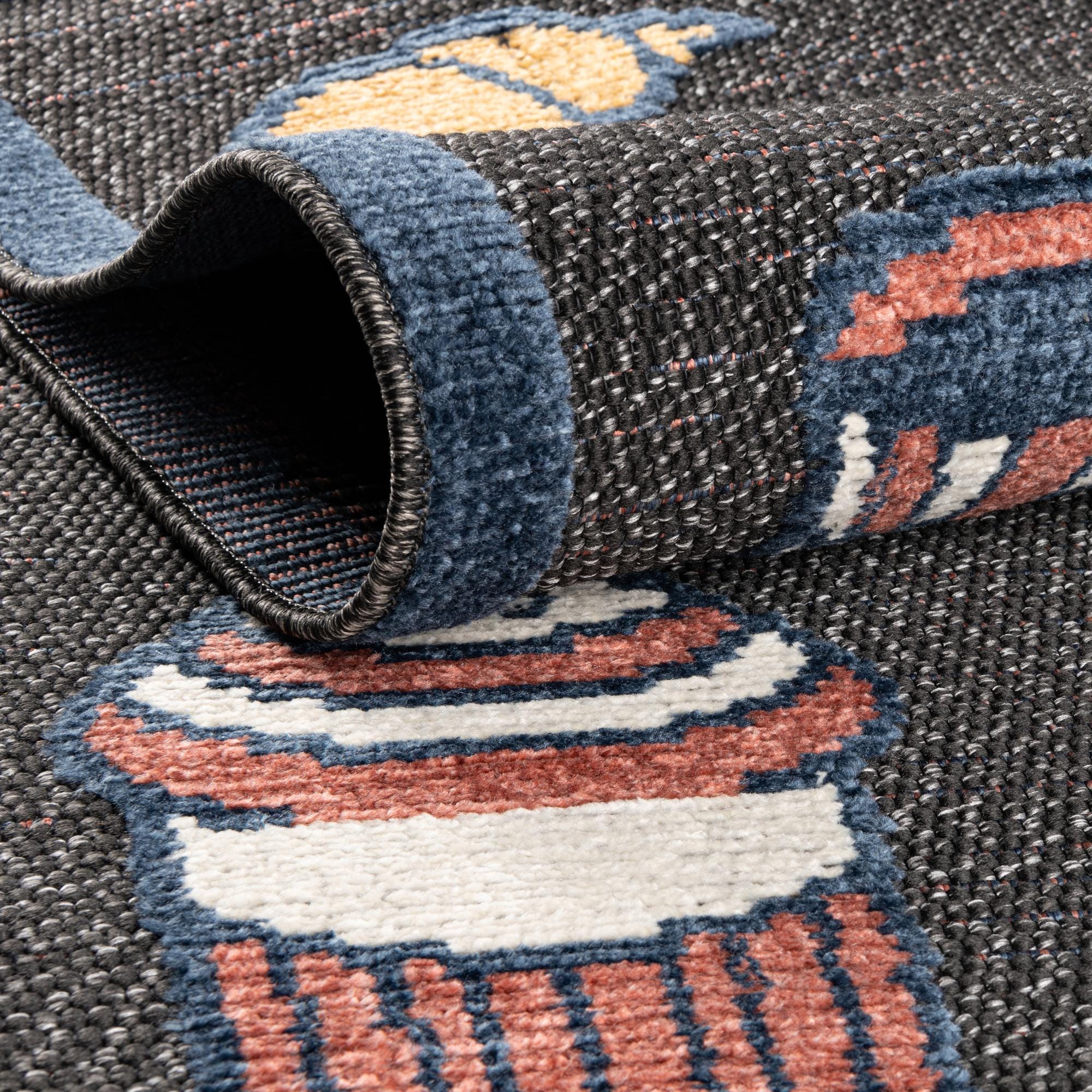 Primary color is Graphite Gray. Colors in this rug include: Graphite Gray, Ivory, Navy Blue, Yellow, Rust Red.