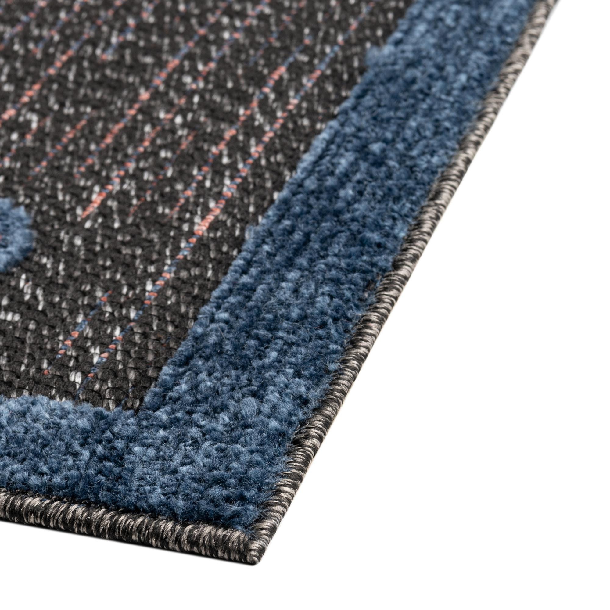 The texture of the rug is crafted for resilience against the elements, and the flat weave construction offers a smooth surface underfoot. The edges are finished in a coordinating navy blue that frames the design nicely. This jovial, café-inspired pattern is well-suited for a kitchen nook, sunroom, or balcony, adding a spirited touch to casual dining areas or any spot where friends and family gather. Its versatile colors and pattern also lend themselves well to eclectic and contemporary decors or anywhere a touch of lightheartedness is desired.