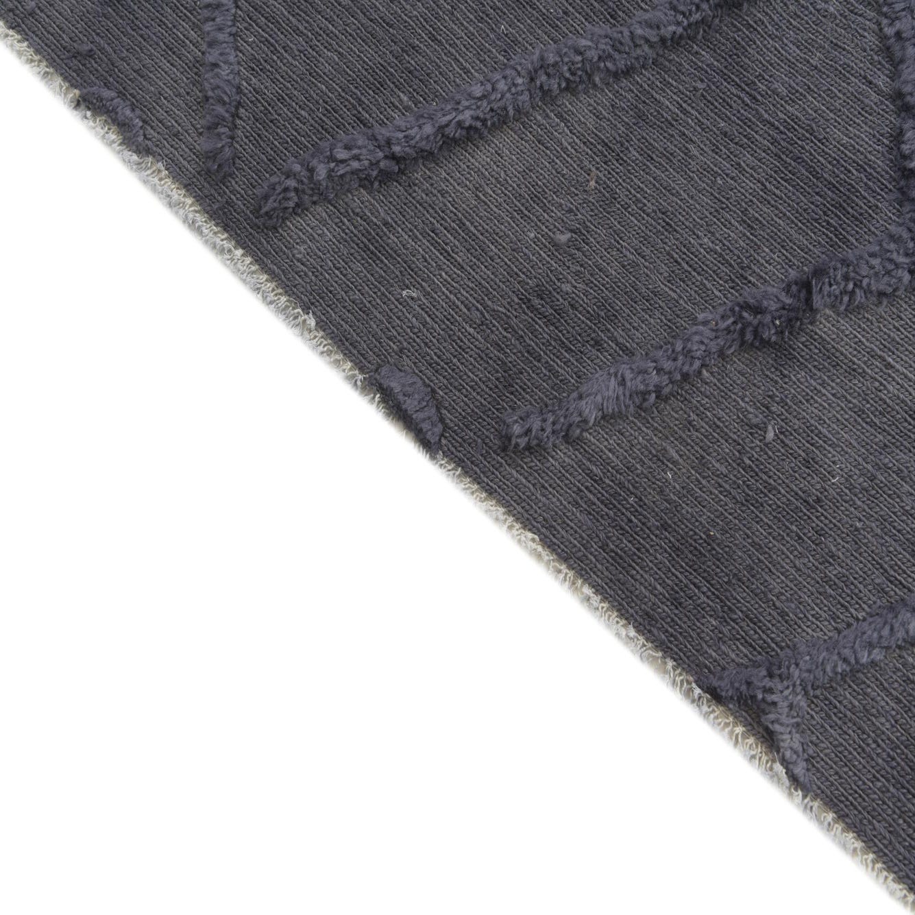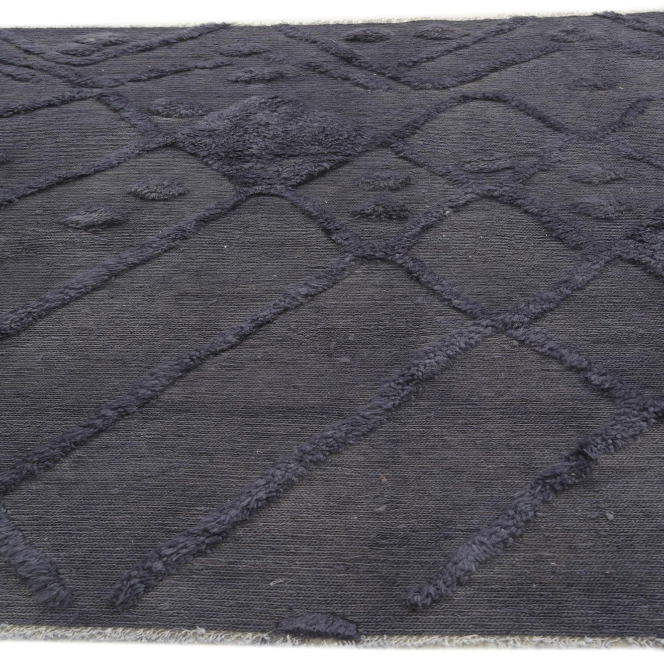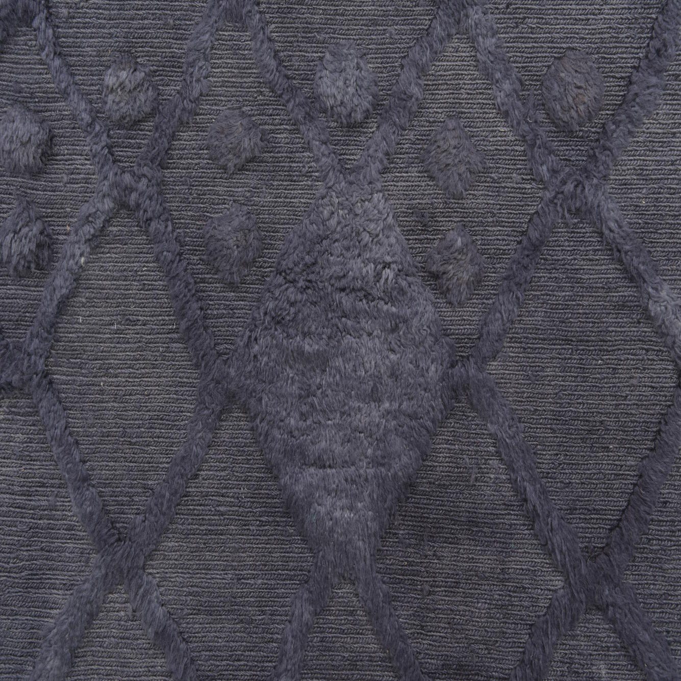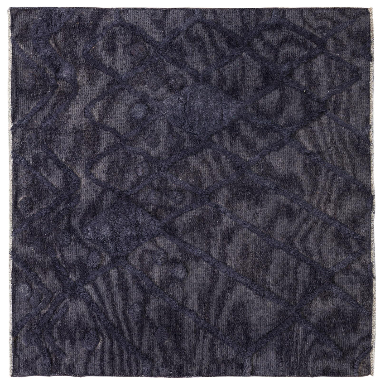 The Darya Collection presents a hand-knotted rug crafted from 100% wool, offering both durability and a soft texture underfoot. This particular 6-foot square rug boasts a deep graphite gray background, complemented by a raised pattern that provides a tactile and visual contrast. The design features an array of geometric shapes, creating a lattice-like effect that adds depth to the rug's surface.