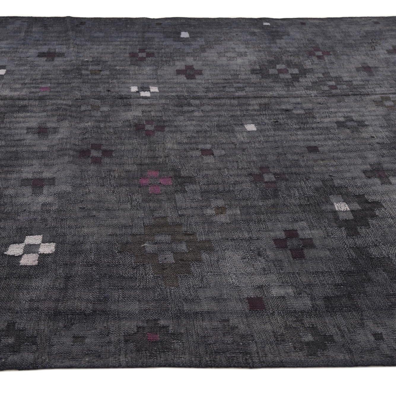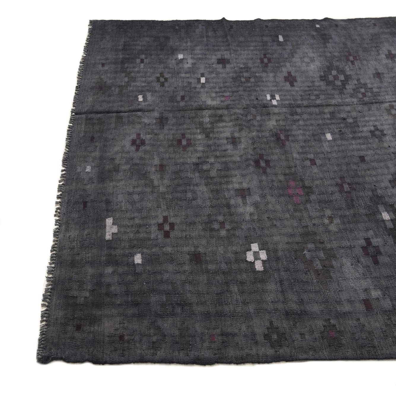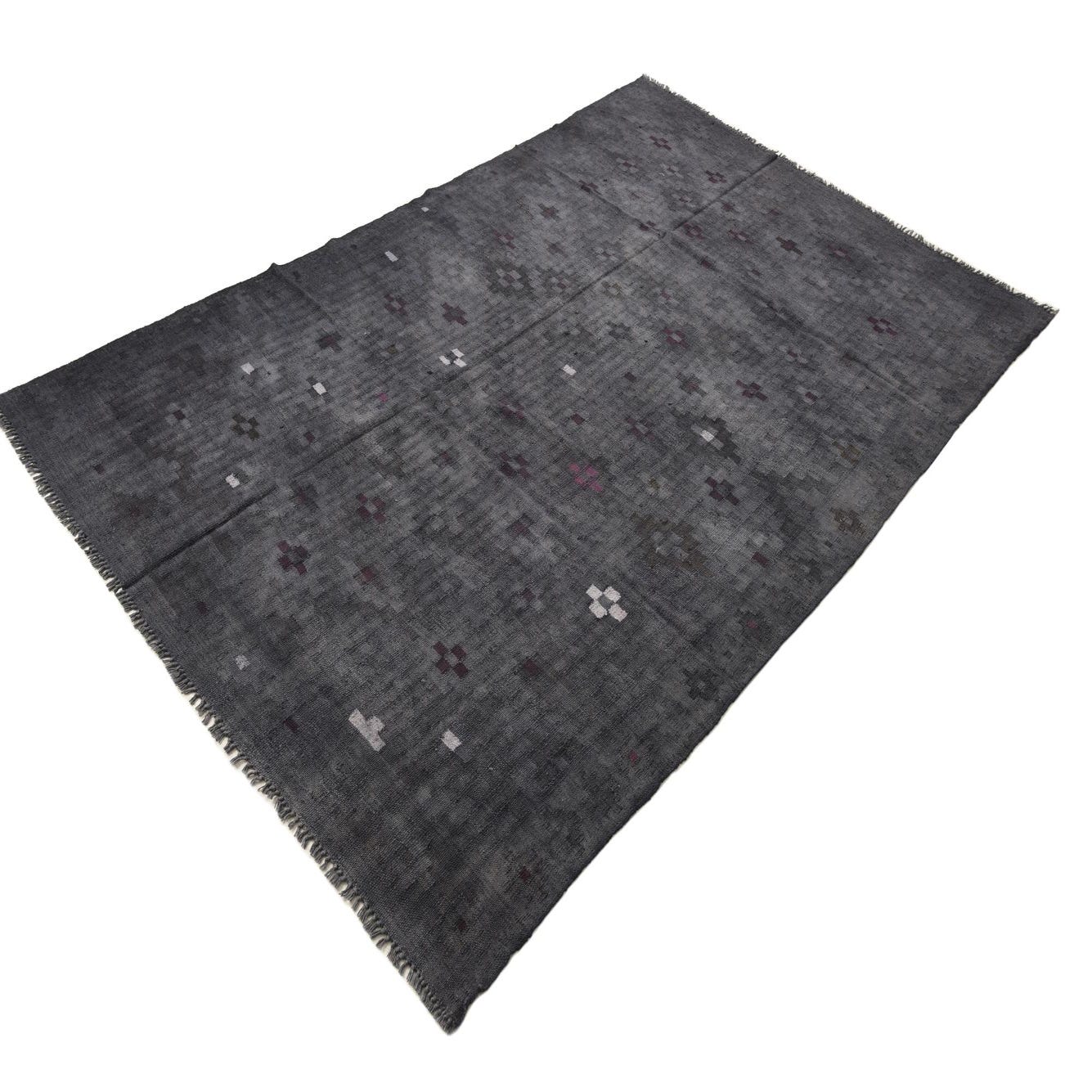 A 6x9 rectangular gray wool Kilim Fars rug with scattered small abstract patterns in white and deep purple.
