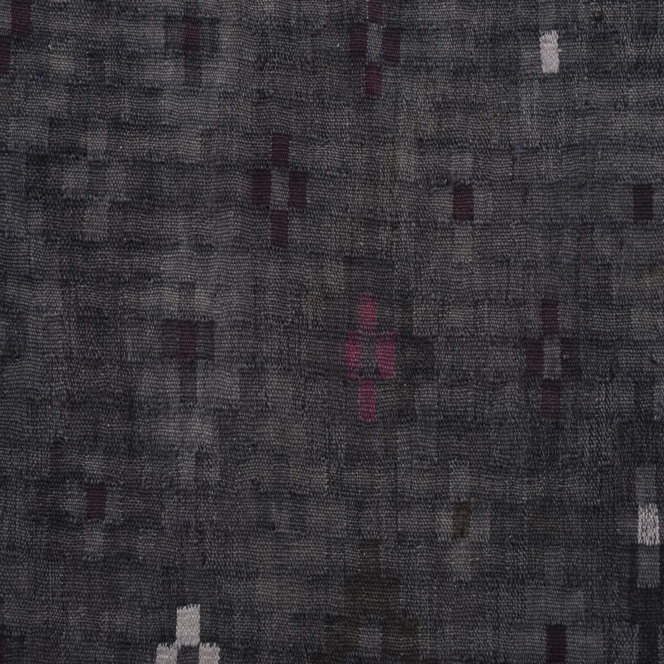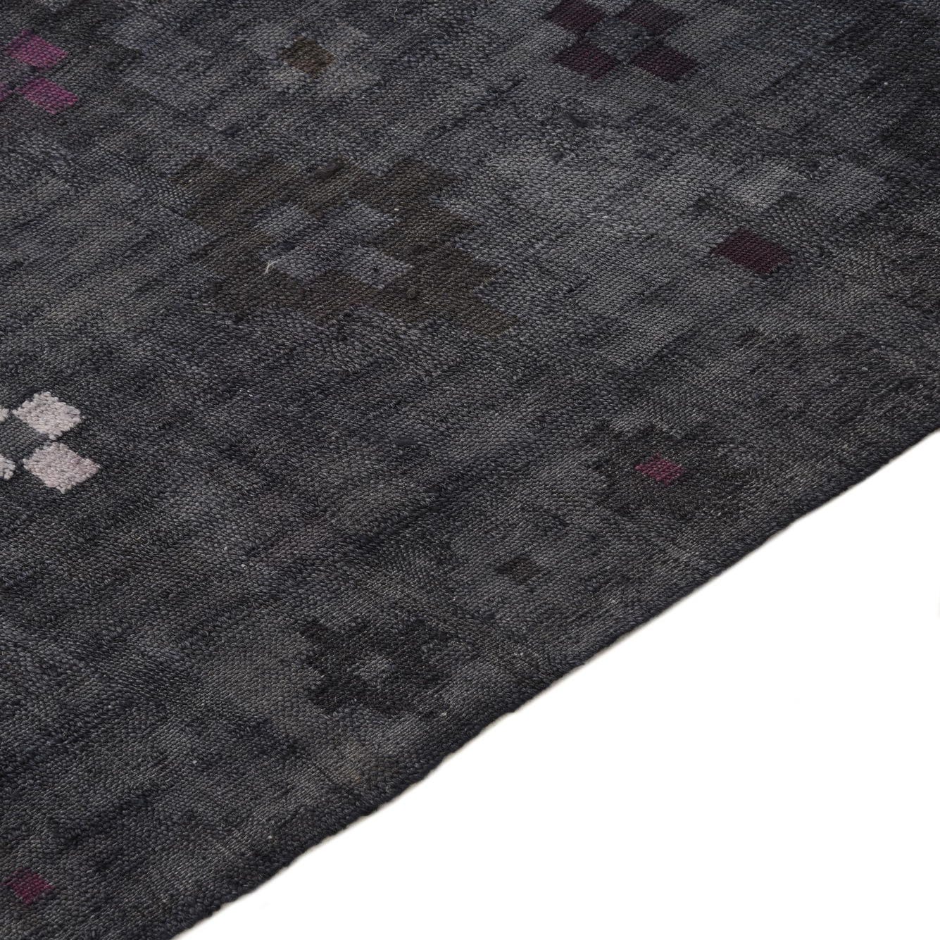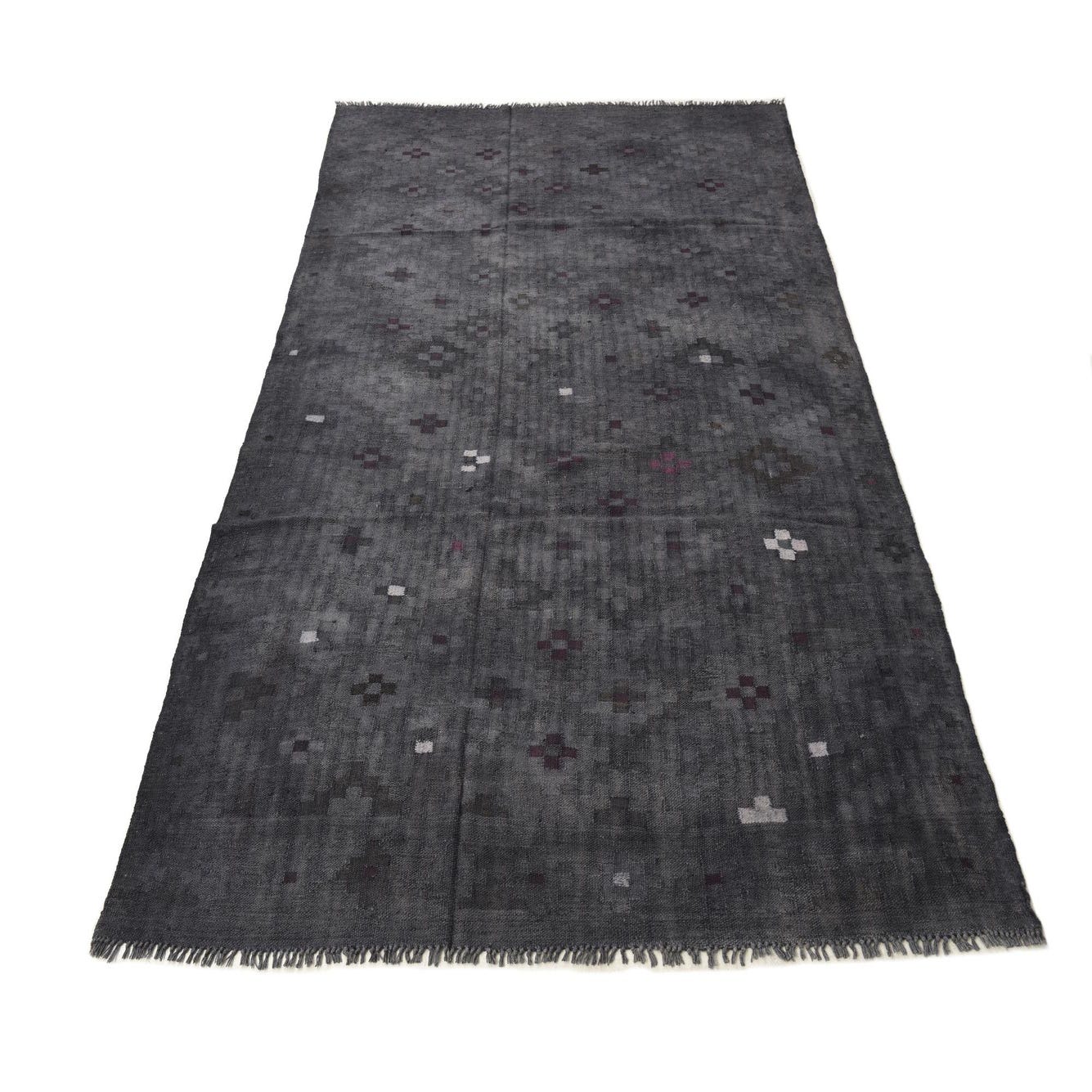A 6x9 rectangular gray wool Kilim Fars rug with scattered small abstract patterns in white and deep purple.