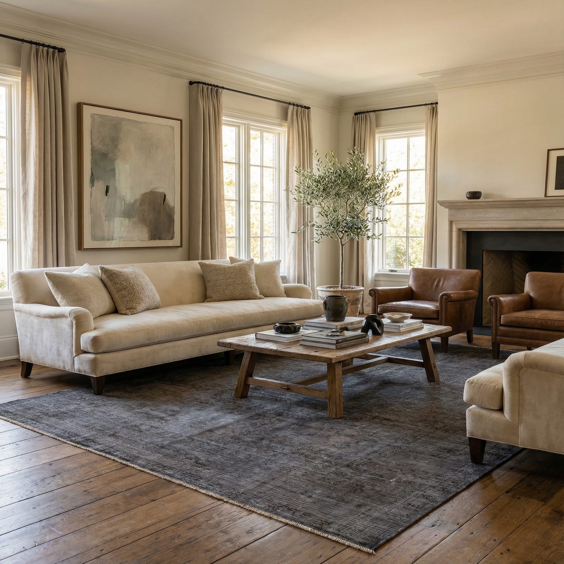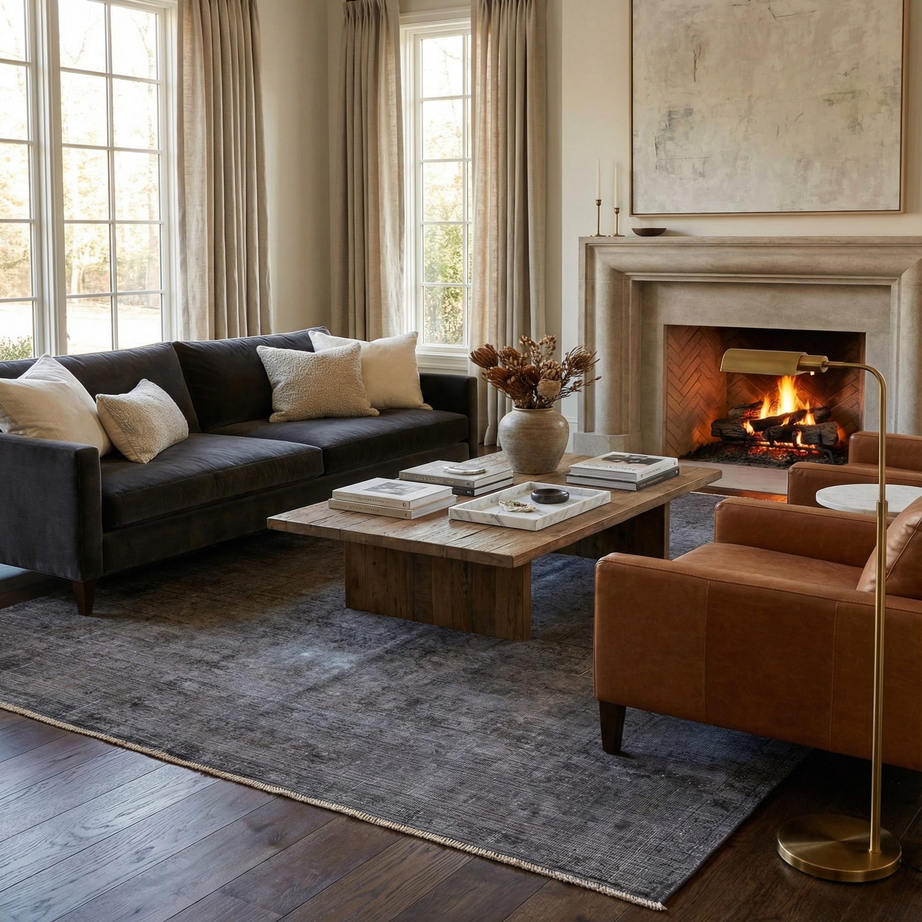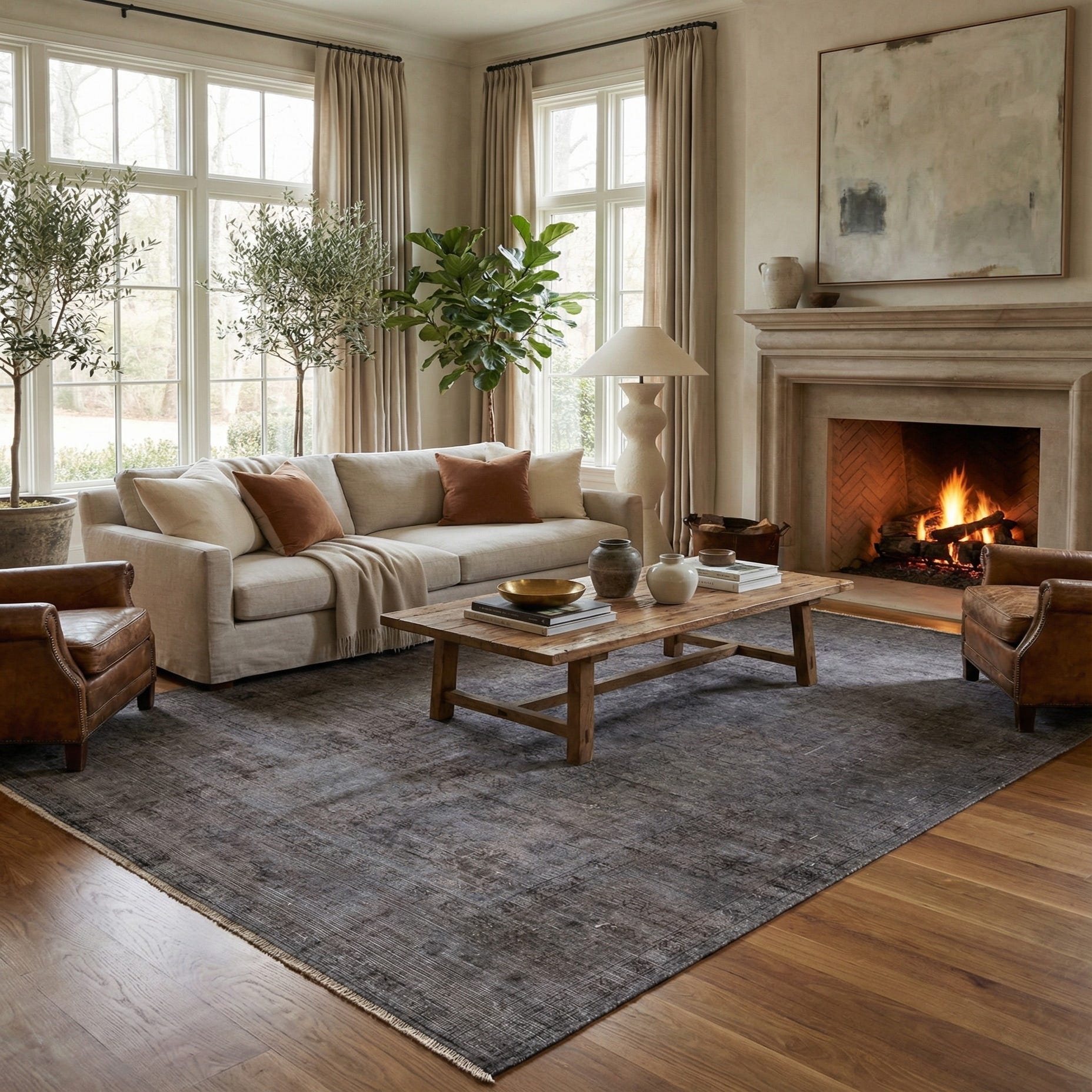 This rug works naturally with a range of interiors: pair it with warm wood and leather pieces for a refined, masculine loft; layer it beneath a neutral sofa and brass accents in a contemporary living room; or use it to anchor a calm, minimalist bedroom with ivory linens and black hardware. The muted palette and understated pattern make it an easy backdrop for textured throws, woven baskets, and matte metals, adding quiet depth without competing with other design elements.
