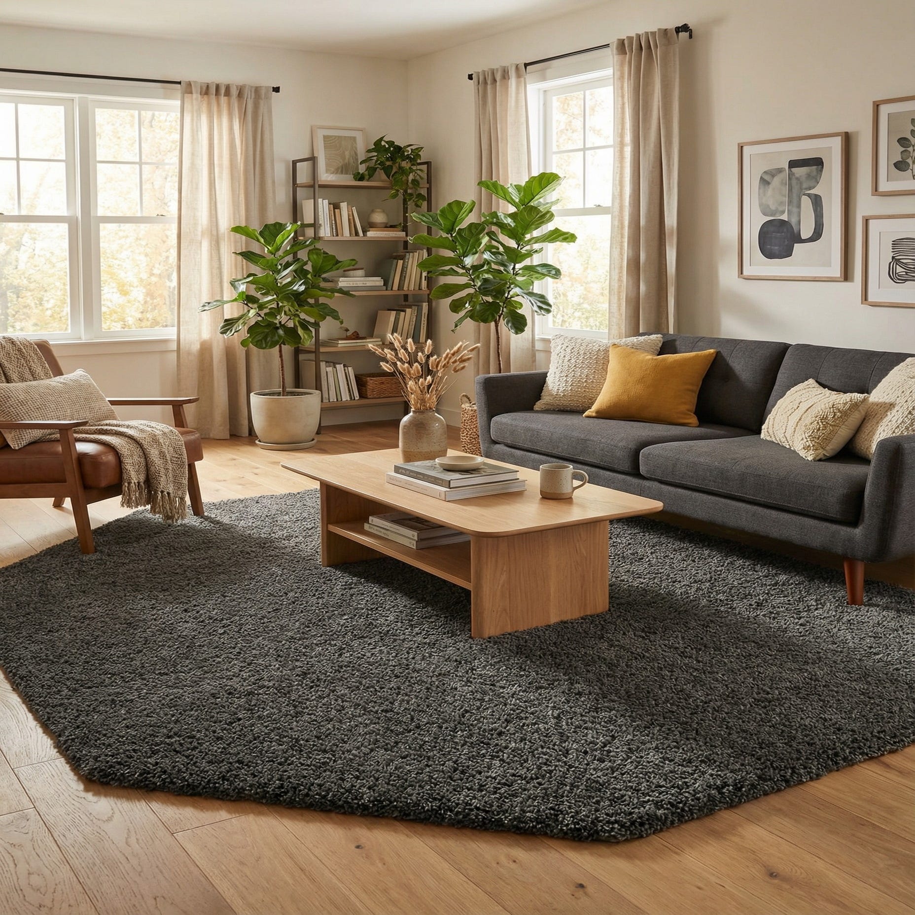 Place it to anchor a seating area or beneath a round coffee table for a layered, contemporary look; its octagonal shape works well in compact living rooms, bedrooms, or a cozy reading nook where a softer underfoot feel is desired. The neutral Graphite Gray pairs smoothly with cool-toned palettes, industrial or modern furnishings, and transitional spaces that benefit from a textured, understated base.