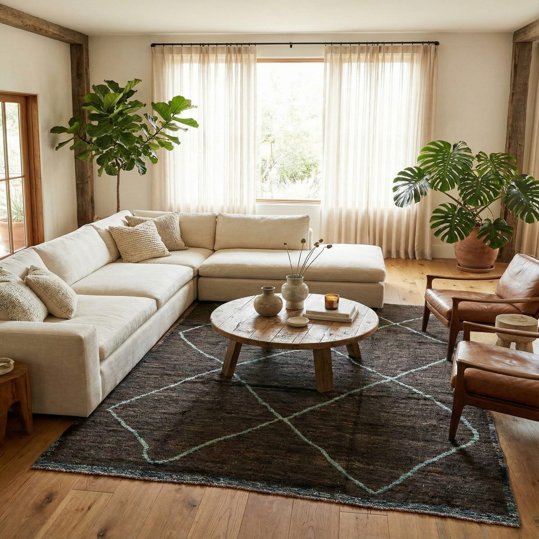 This piece works well as an anchor for a living room seating group, beneath a dining table to introduce pattern without overwhelming the space, or layered at the foot of a bed to add texture and grounding. Pair it with warm wood furniture and leather, or contrast it with pale linens and light upholstery to highlight the Light Blue and Ivory accents. Its straightforward geometry adapts easily to modern, transitional, and casual interiors.