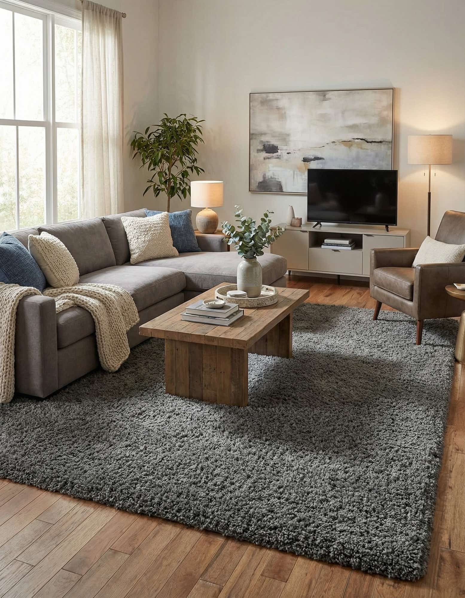 A large 9x12 rectangular gray shag area rug, perfect for adding warmth and modern style to a living room.