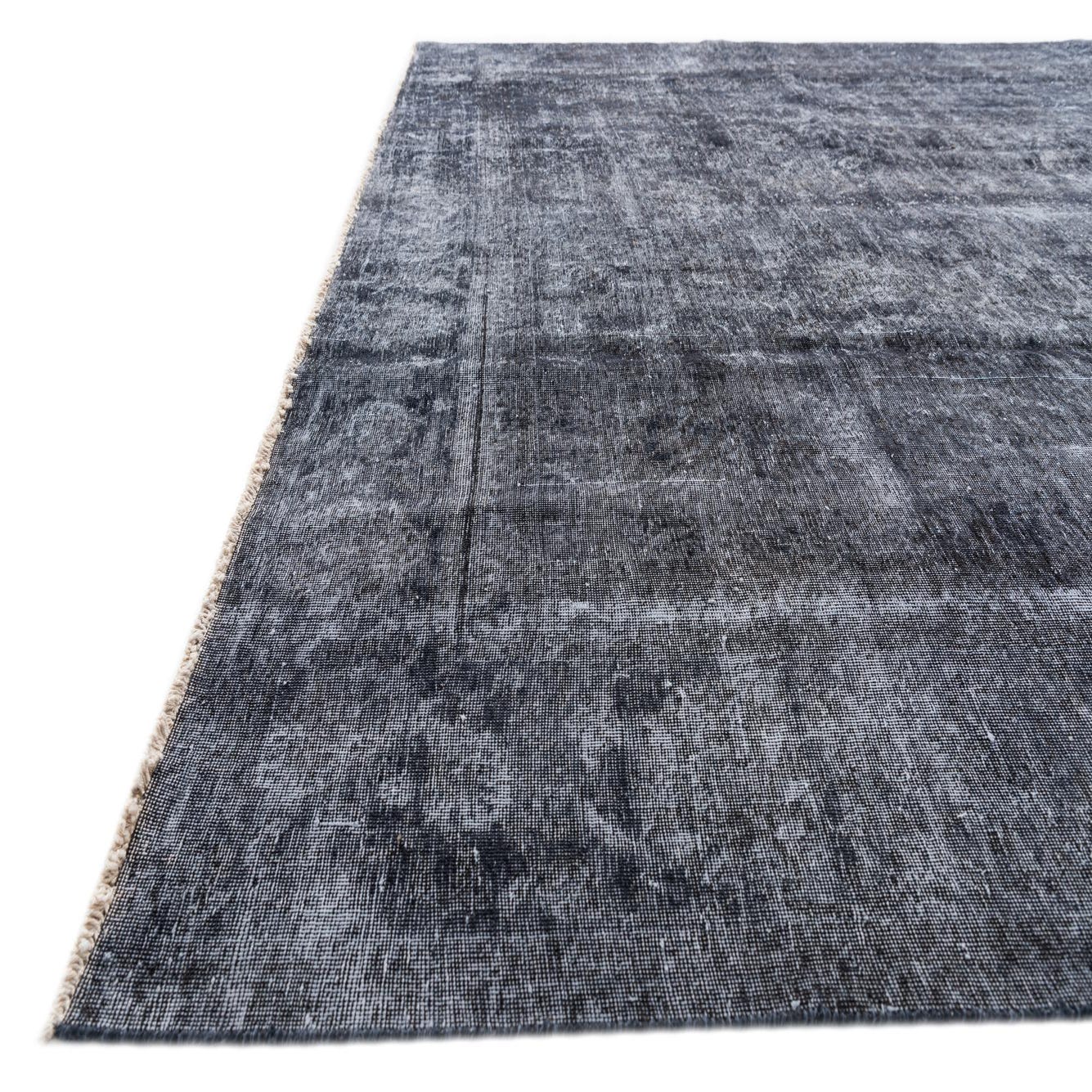 A low-contrast, vintage-inspired field with a faint rectangular border gives this rug a quietly worn character. The graphite gray background provides a deep, even base while black accents weave through the surface to create soft variations in tone and subtle visual texture. Hand-knotted in 100% wool, the pile feels dense and slightly plush underfoot with a muted luster that catches light differently as you move across it, enhancing the lived-in look without competing with other room elements.