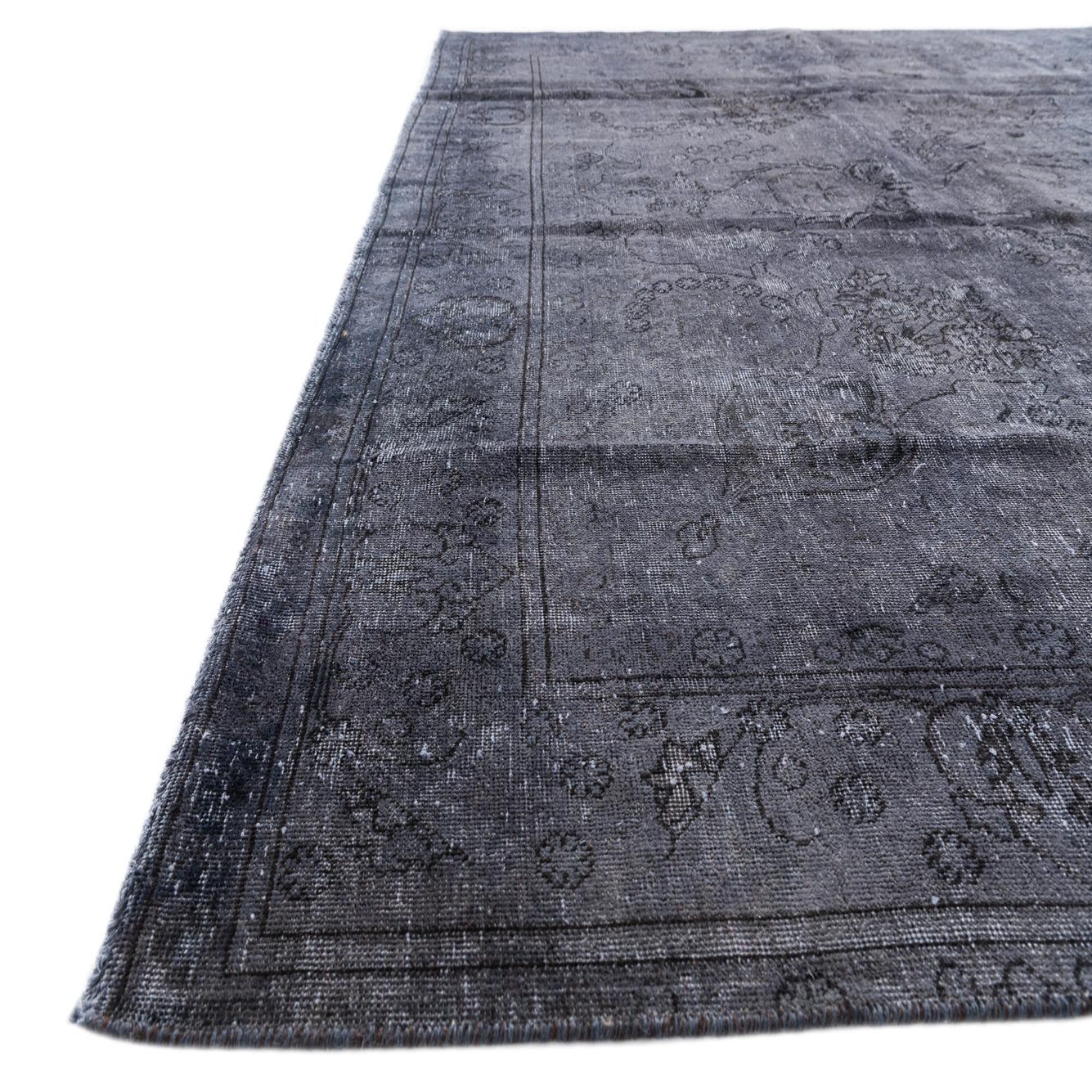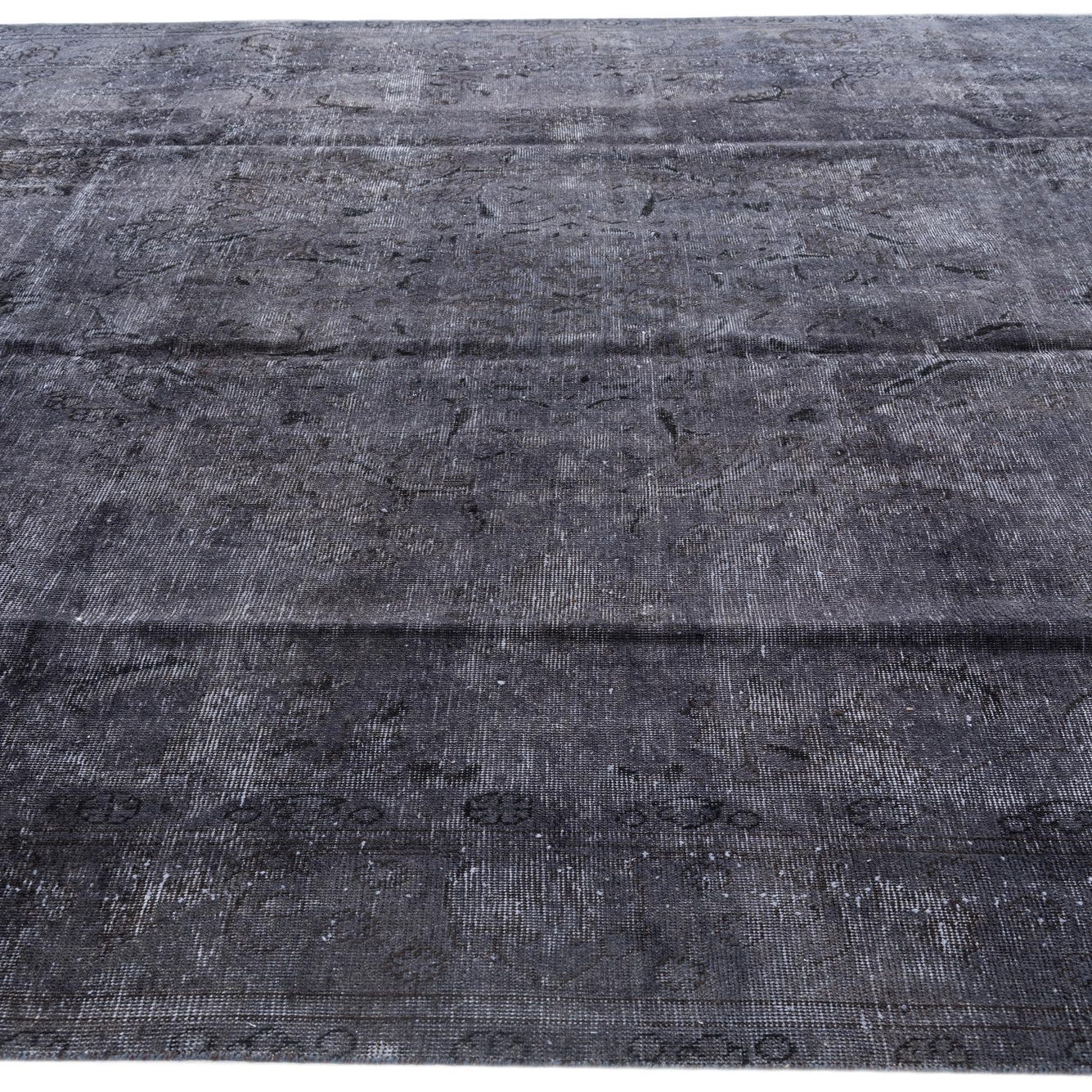 The Ultra Vintage collection offers a refined addition to any space with its hand-knotted 9x12 area rug, crafted from 100% wool. This rug features a predominantly graphite gray background, imbued with subtle variations of black and gray tones that create a rich visual texture. The understated pattern echoes traditional designs, lightly distressed to blend a sense of heritage with contemporary aesthetics.