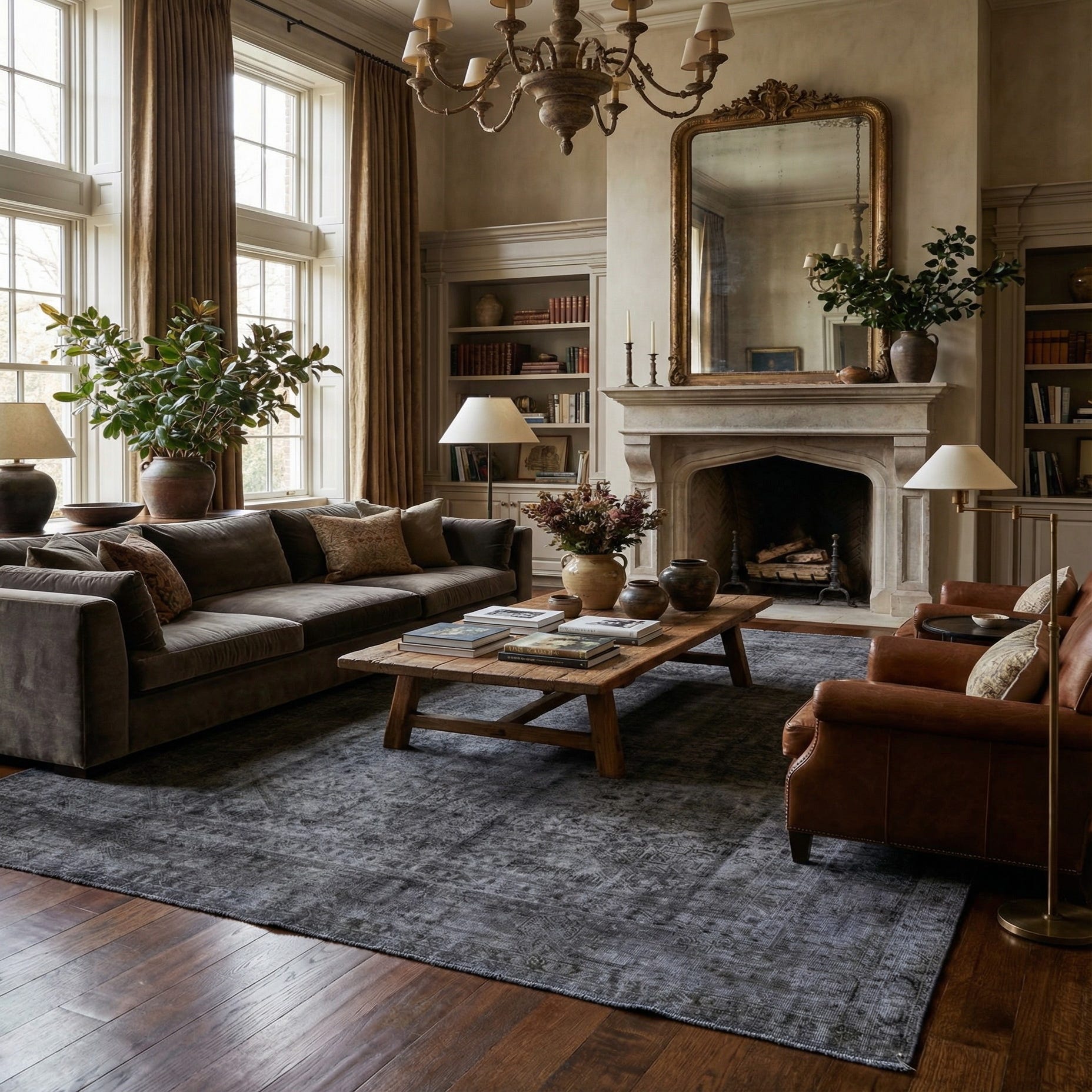 The restrained palette and worn texture make this piece a versatile anchor for a range of interiors. It pairs naturally with industrial and contemporary furnishings—charcoal leather seating, matte metals and reclaimed wood—as well as minimalist schemes that need a grounding, tonal element. Use it to define a living area, sit it beneath a dining table, or layer it in a bedroom; it complements warm metals, natural leathers and textured linens while lending a cohesive, lived-in look to the room.