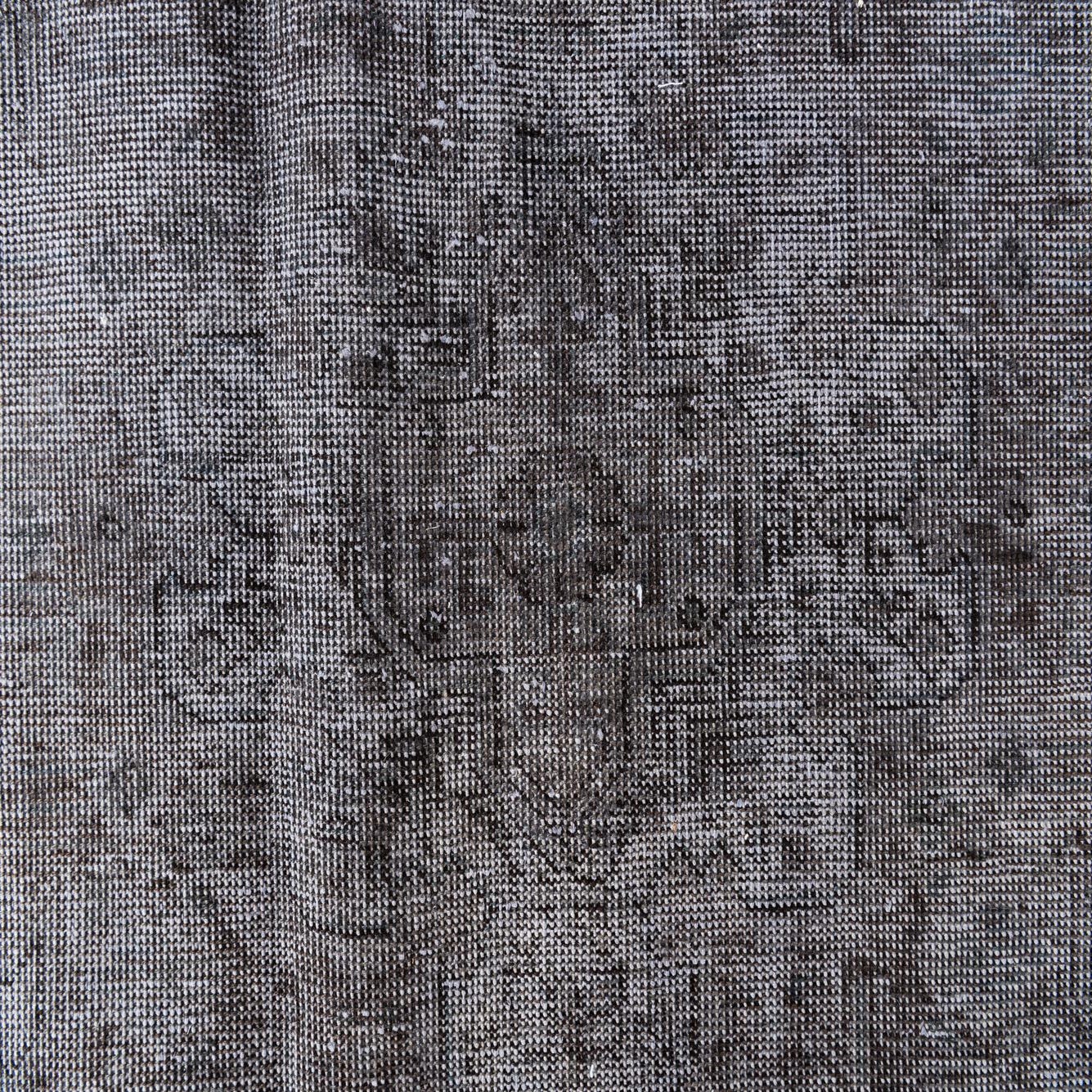 Hand-knotted of 100% wool, this rug presents a vintage-inspired, low-contrast pattern set on a Graphite Gray background. Subtle black and mid-gray motifs form a faded central medallion and an ornate border, worked into the field with a gently distressed finish that adds depth without strong contrast. The dense, low-profile pile feels soft underfoot; when you run your hand across it the wool compresses and rebounds, revealing slight shifts in tone where the fibers catch the light.