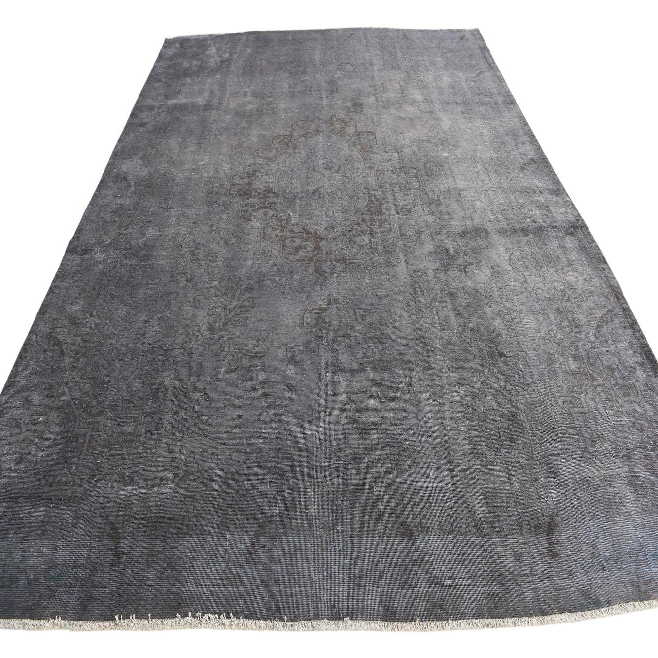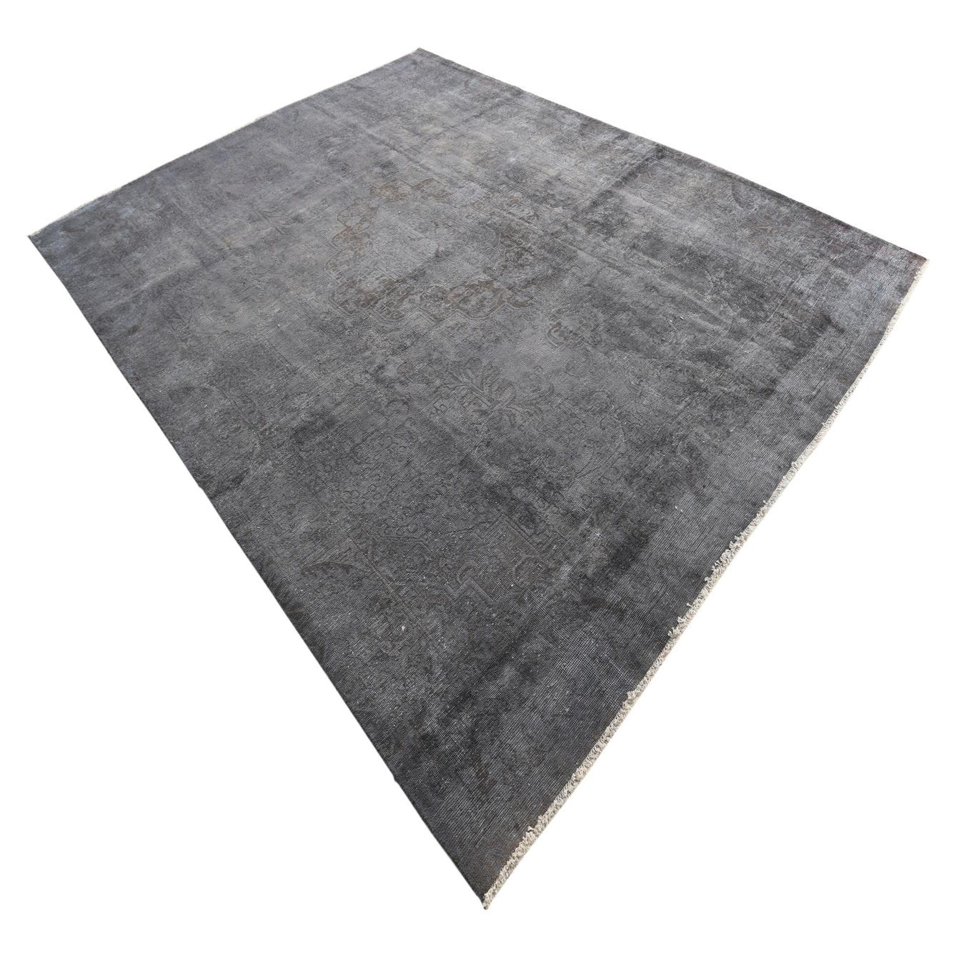 A large 9x12 rectangular gray wool area rug with a subtle, faded Persian medallion pattern, suitable for a living room.