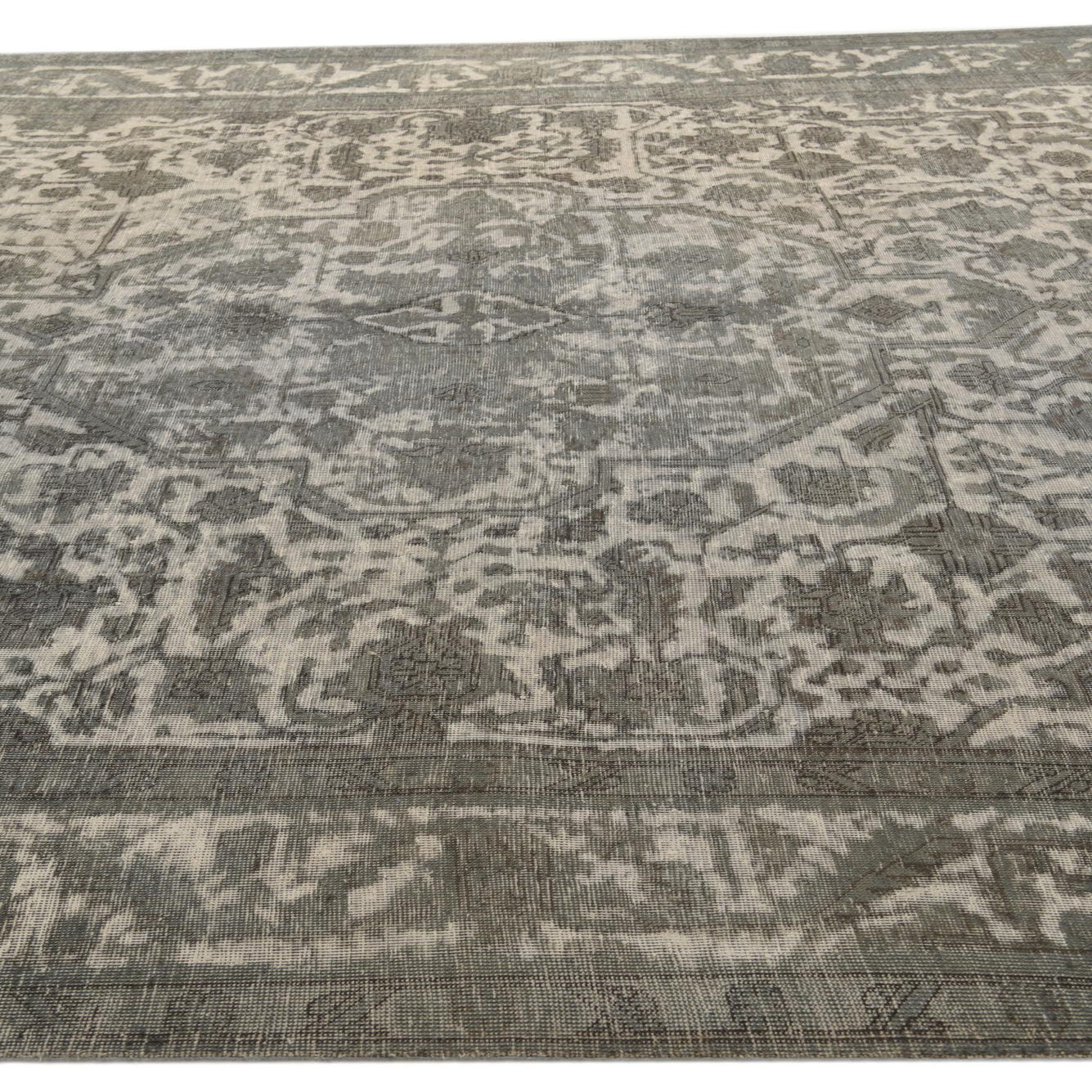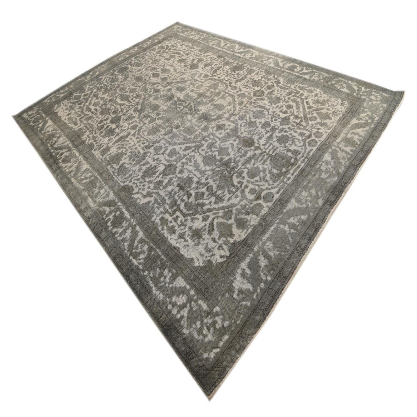 A large 9x12 rectangular gray and silver Persian-style wool rug with an intricate floral and medallion pattern.