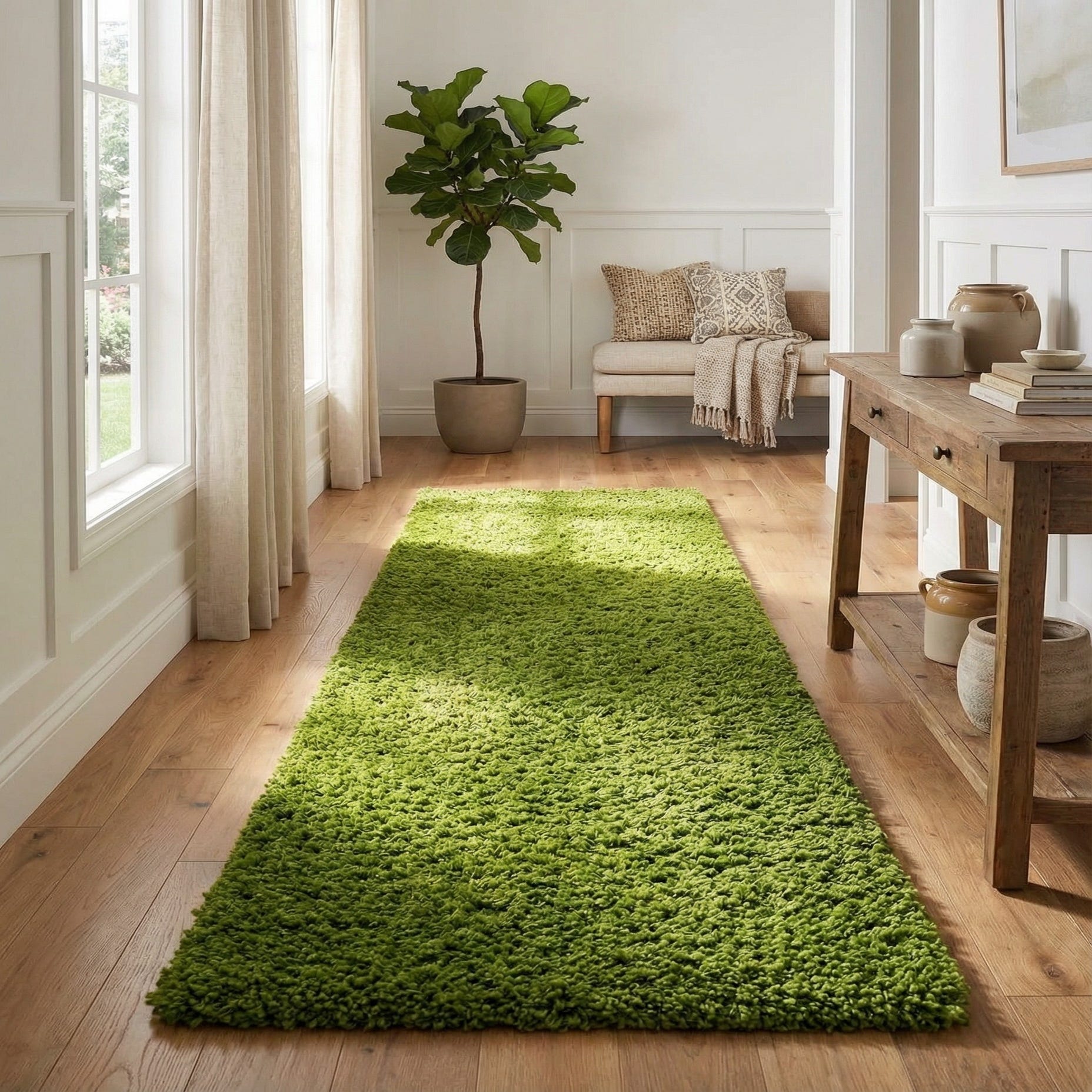 A solid, monochrome runner in a lively Grass Green, this rug features a deep shag pile that invites you to run your hand across its dense, springy surface. The high-pile construction creates a tactile, textured field rather than a printed pattern, with subtle shifts in tone as the polypropylene fibers catch light. Machine made from 100% polypropylene, the pile feels plush underfoot while maintaining an even, consistent finish along the edges.