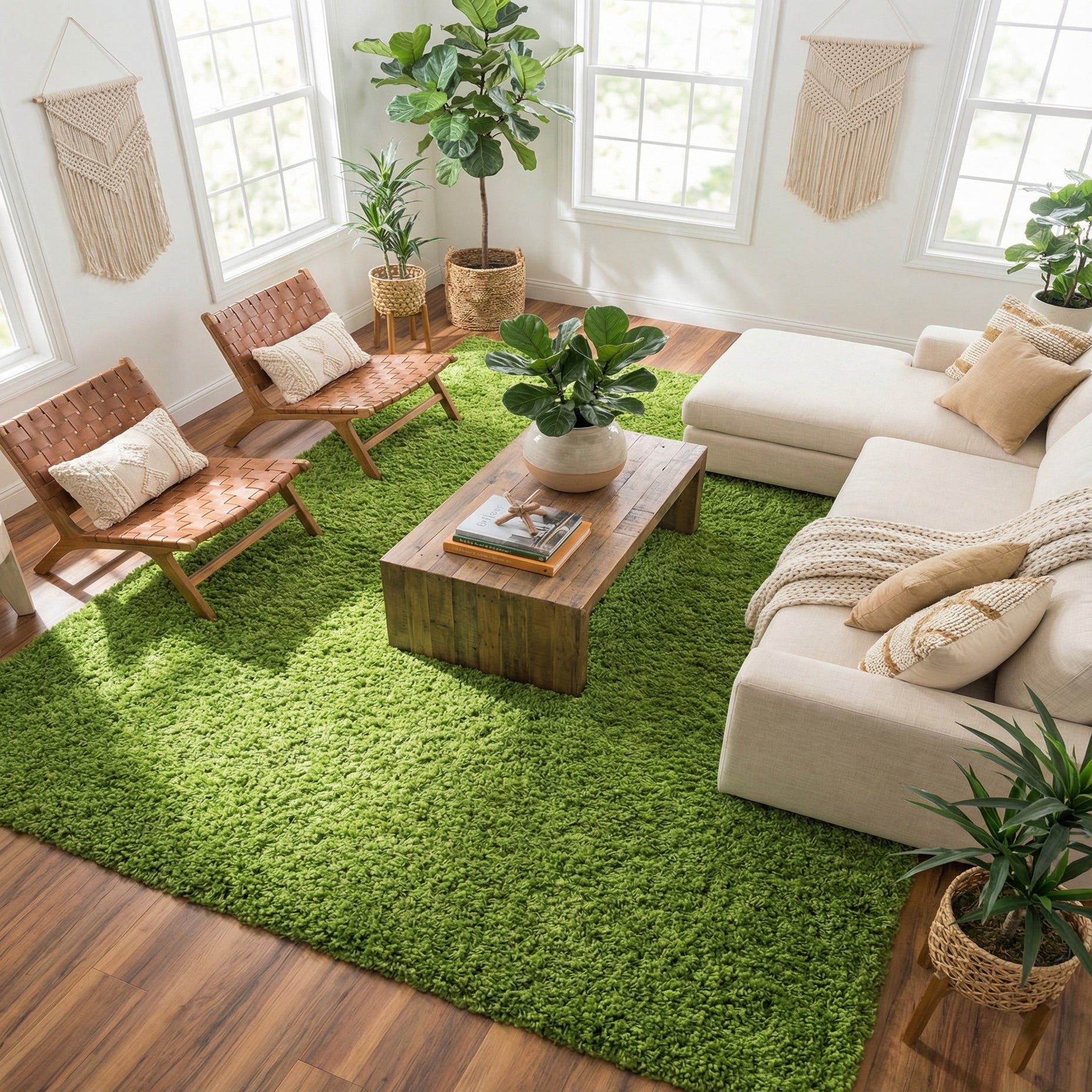 This rug works well where a strong color statement and cozy underfoot feel are desired: layer it under a low-profile sofa to define a living area, place it beside the bed for a warm wake-up step, or add it to a playroom or home office to brighten the floorplane. The grass green pairs naturally with light woods and neutral linens, and it also complements black-and-white accents or warm metallics for a more contemporary scheme.