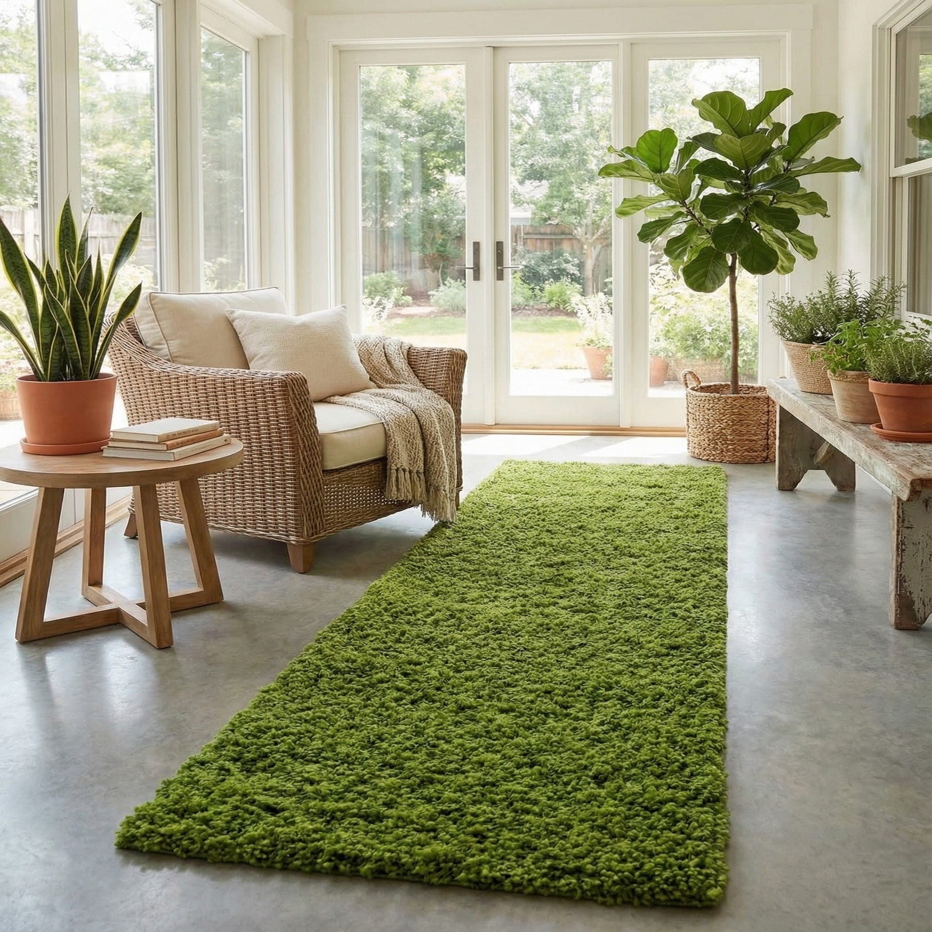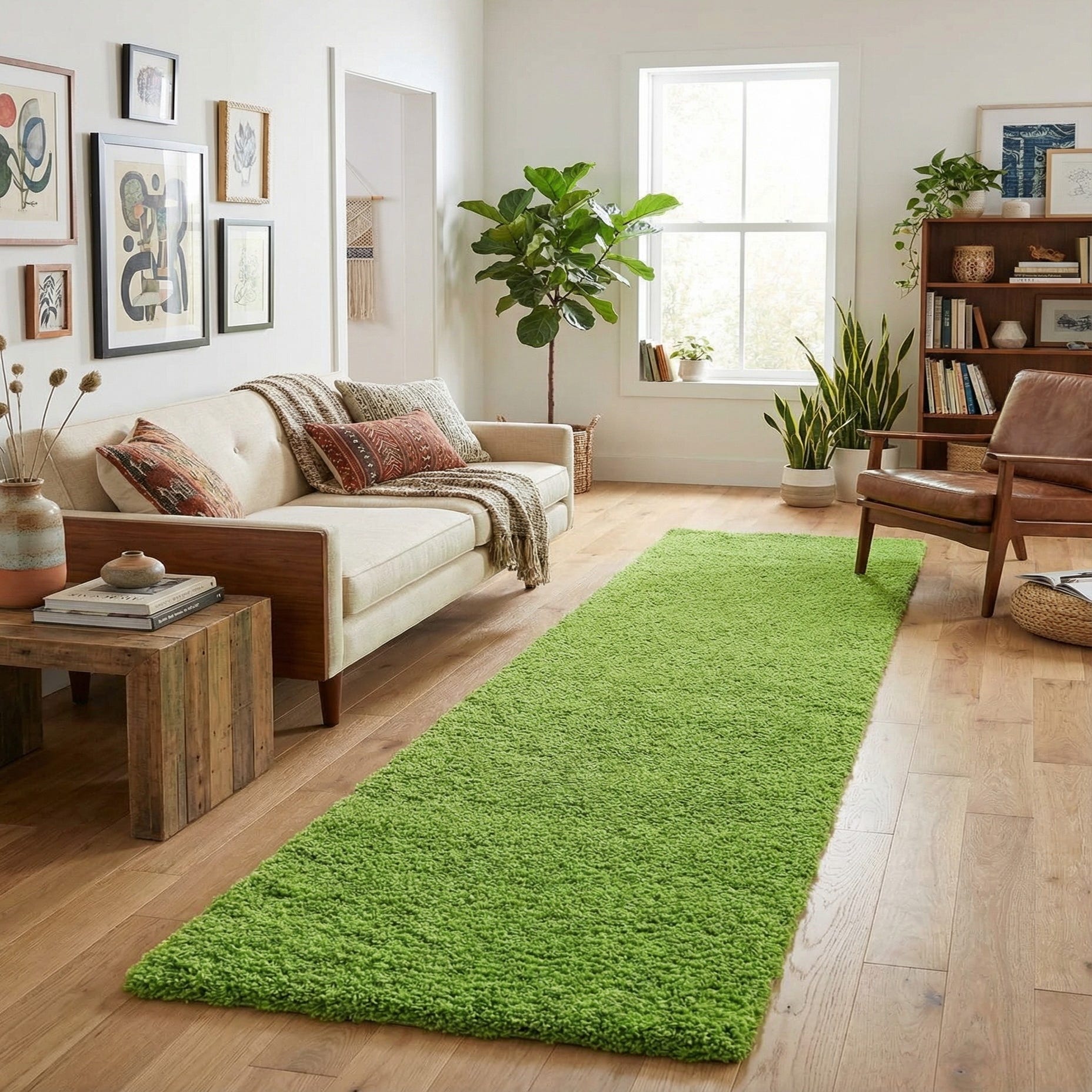 Place this runner down a hallway to introduce a lively accent color, layer it alongside a bed to add warmth and softness underfoot, or use it in a mudroom or play area where a bright, cheerful tone complements practical furnishings. It pairs well with light wood floors and neutral walls for a Scandinavian or modern aesthetic, and it also anchors eclectic or botanical-themed rooms where a burst of green ties other elements together.