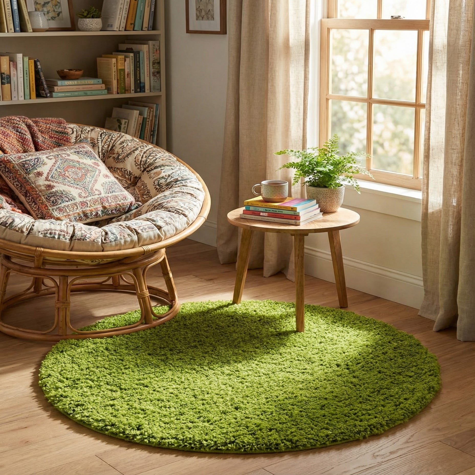 A single-field design in a lively grass green, this round shag rug brings concentrated color and a tactile presence to any space. The high, dense pile is plush underfoot—individual polypropylene strands gather into a soft, slightly springy surface that invites you to walk or sit on it. The solid pattern keeps the look clean and modern while the deep texture adds visual interest without introducing competing motifs.
