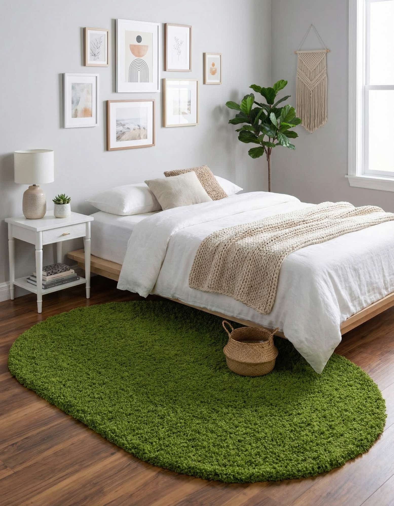 A plush oval shag in a lively grass green, this machine-made rug is crafted from 100% polypropylene for a dense, soft pile that cushions underfoot. The surface is uniformly shagged with no printed pattern, presenting a solid field of color with subtle depth from the long fibers. The rounded shape softens angles in a room and gives a casual, contemporary feel that’s tactile and inviting.