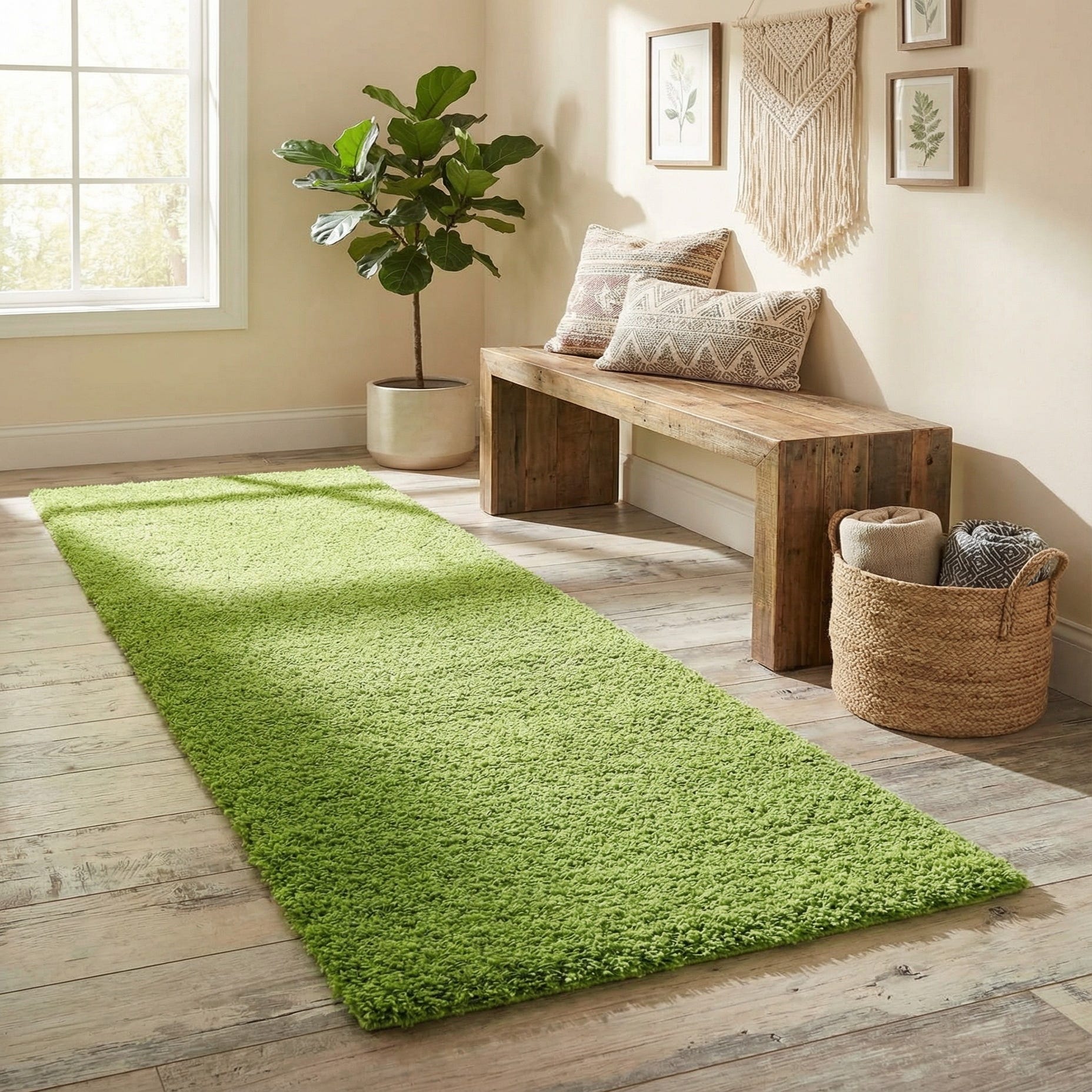 A single-color shag in a true grass green, this runner offers a clean, unadorned pattern with a uniformly dense pile. Machine-made from 100% polypropylene, the surface has a soft, lofty texture you can feel beneath bare feet—twisted yarns create a plush, tactile finish with gentle movement in the pile. The consistent color and texture keep the look simple and contemporary while adding a lively, natural tone to the floor.